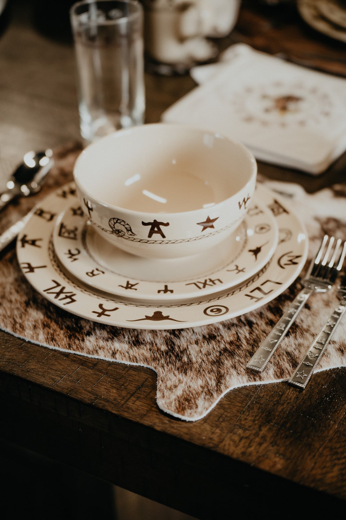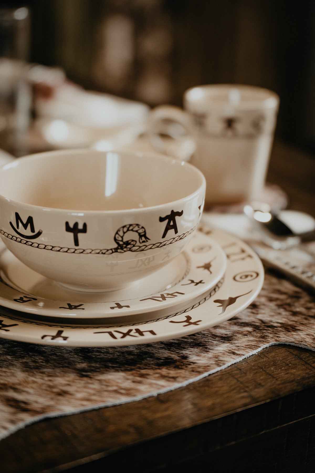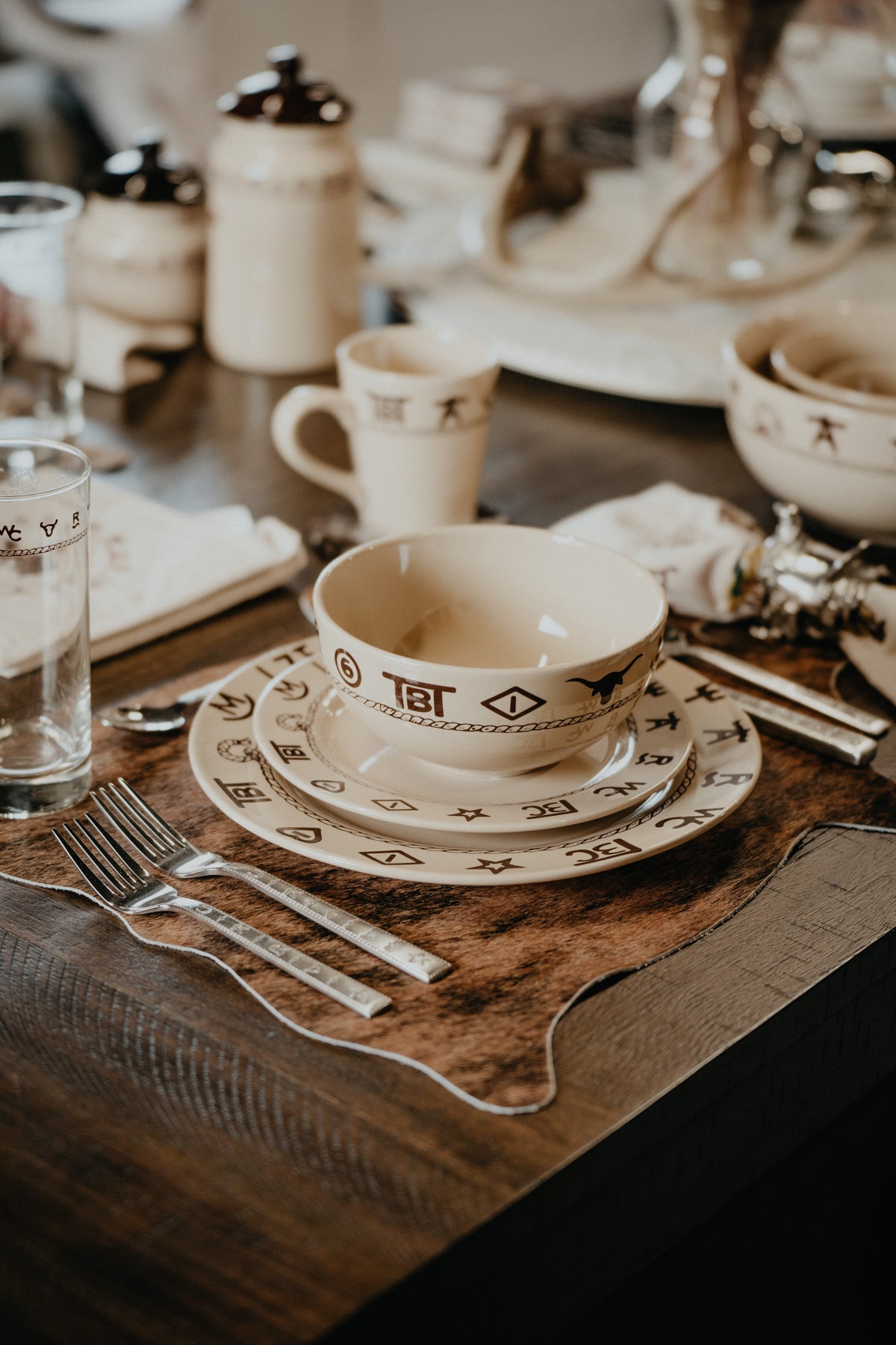 Set your table in beautiful rustic western style with this beige ceramic dinnerware set featuring a brand and rope border. Featuring 4 place settings - this 16 piece set includes 4 large dinner plates, 4 salad plates, 4 large cereal/soup bowls, and 4 coordinating mugs.