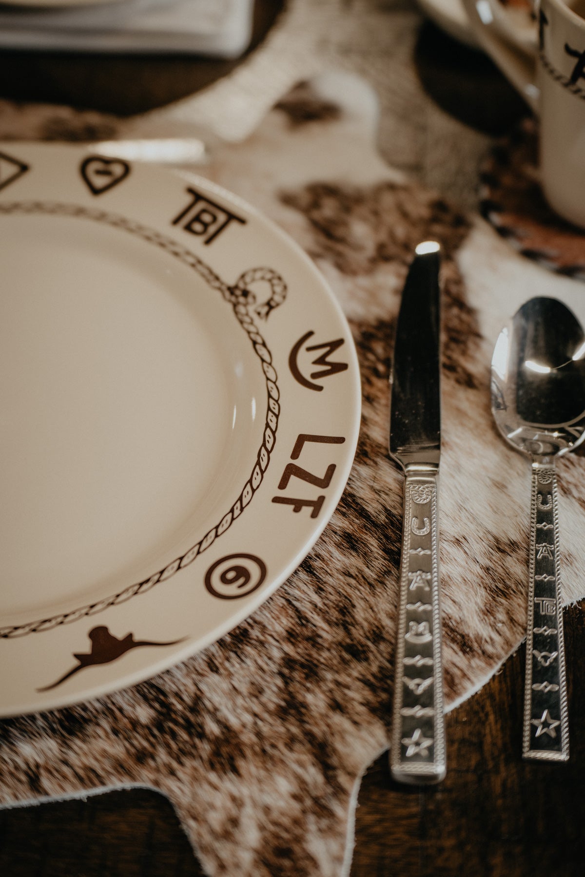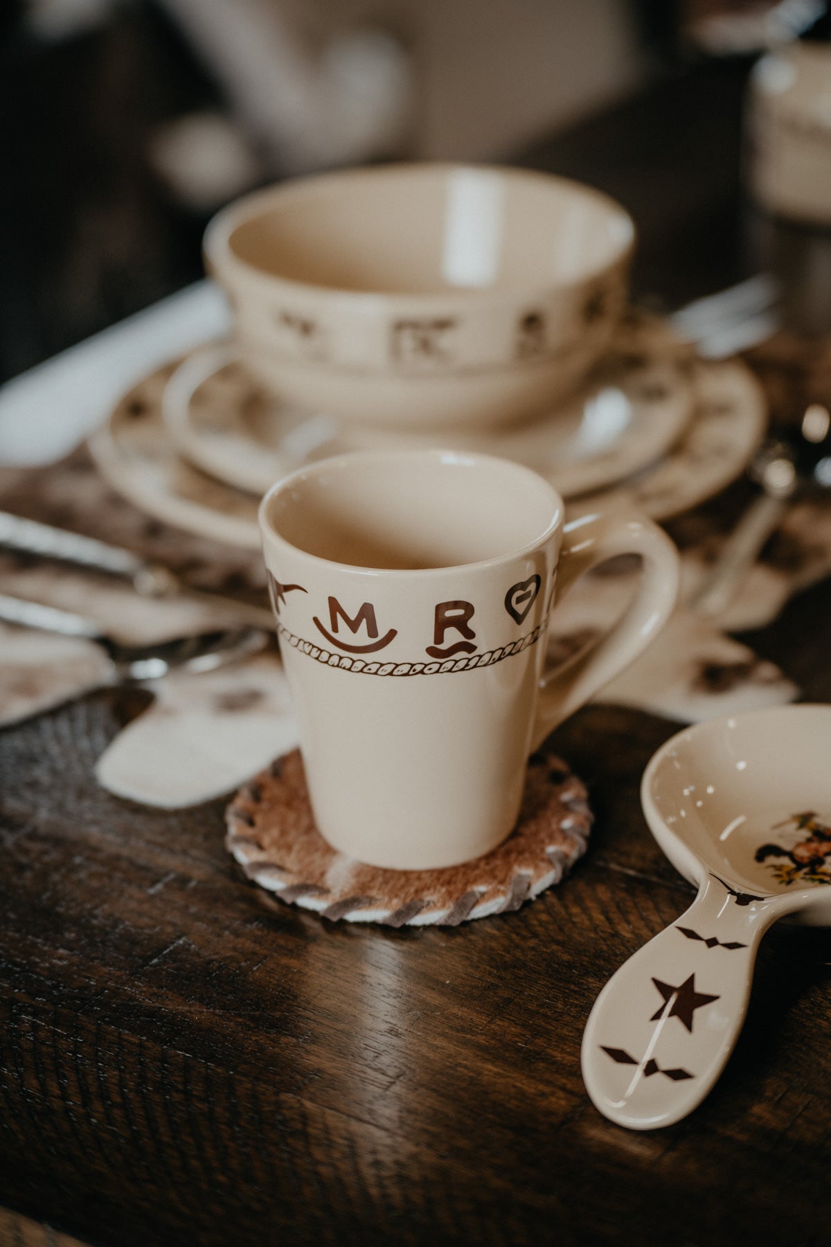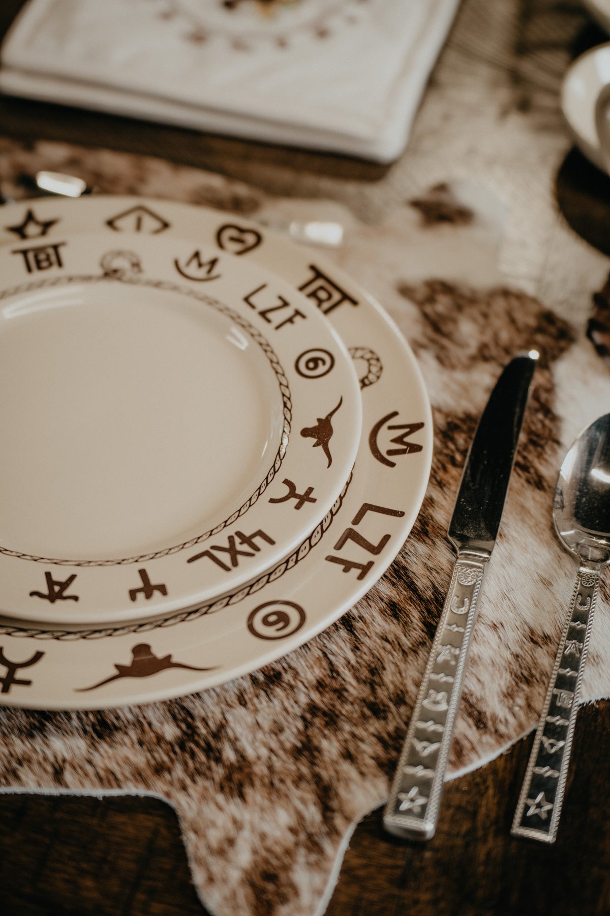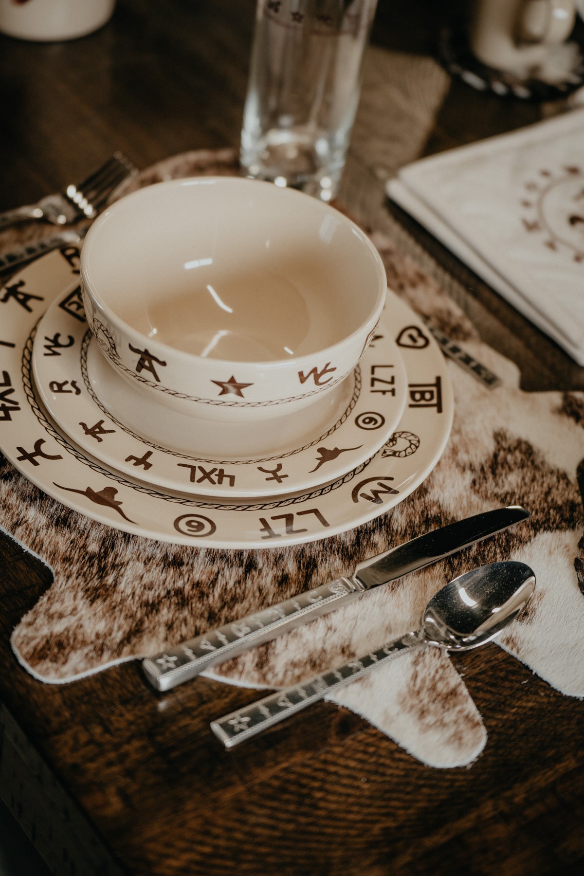 Set your table in beautiful rustic western style with this beige ceramic dinnerware set featuring a brand and rope border. Featuring 4 place settings - this 16 piece set includes 4 large dinner plates, 4 salad plates, 4 large cereal/soup bowls, and 4 coordinating mugs.