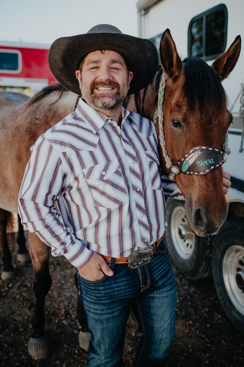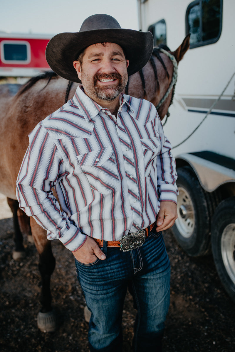 This western pearl snap 'Ryker' brings out all the charm in this ivory and red retro pinstripes! This shirt has two Snap chest pockets for added convenience. We are thrilled to have matching youth and infant options available in this stunning shirt.