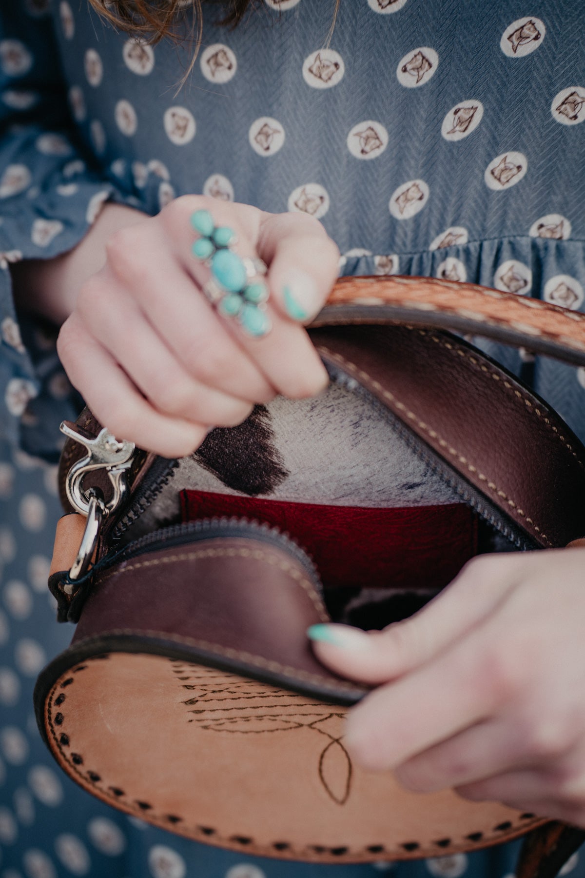 From the gorgeous leather tooled detail to the fun round canteen design - these handcrafted bags by Alamo Saddlery are such a head turning everyday handbag we know you'll cherish for years to come!