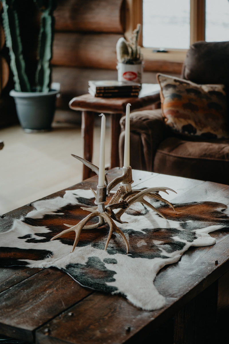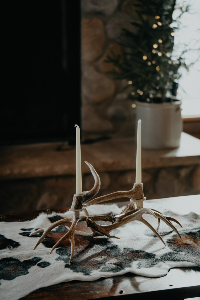 Add a wild touch to your home decor with this Authentic White Tail Mule Deer Antler Candelabra. Handpicked from naturally shed antlers and crafted with care, it brings a rustic charm to any space. Perfectly designed to holds 2 candlesticks, it’s a one-of-a-kind piece that sparks conversation and cozy vibes.
