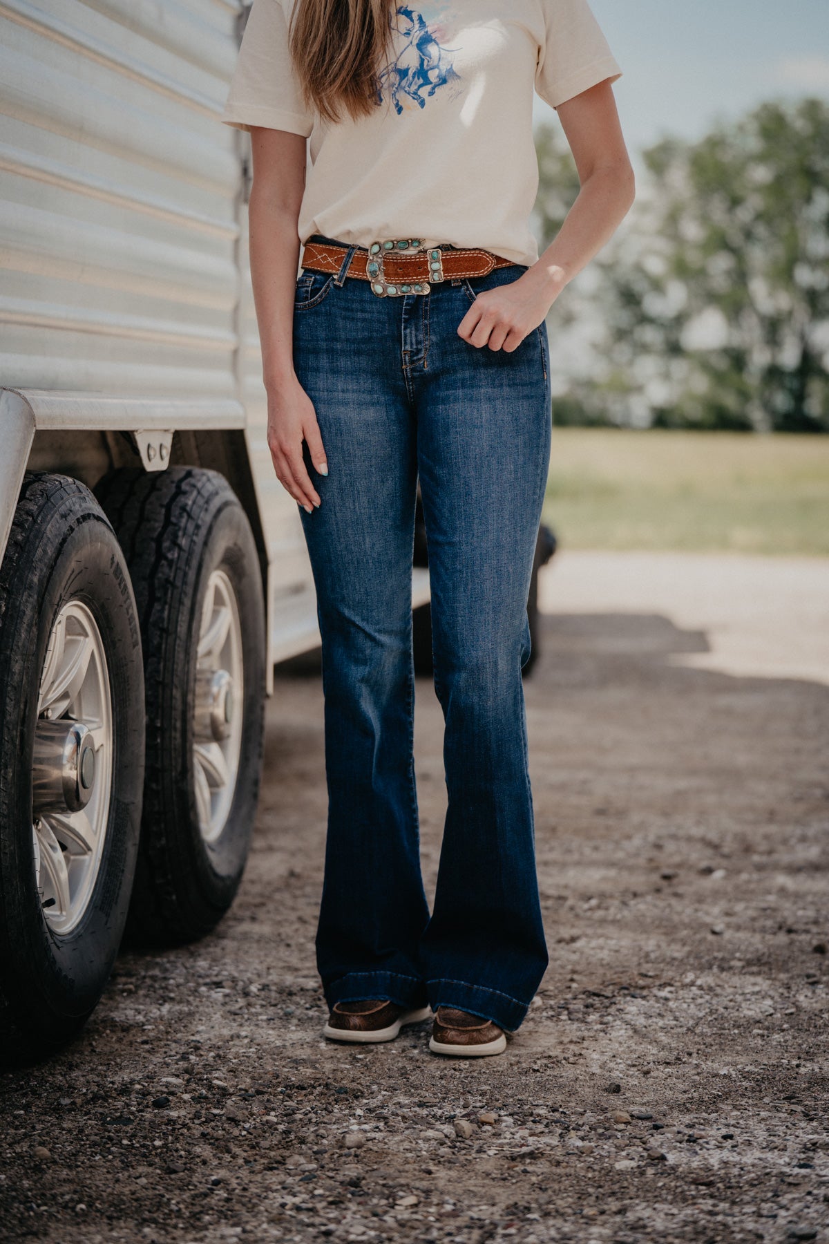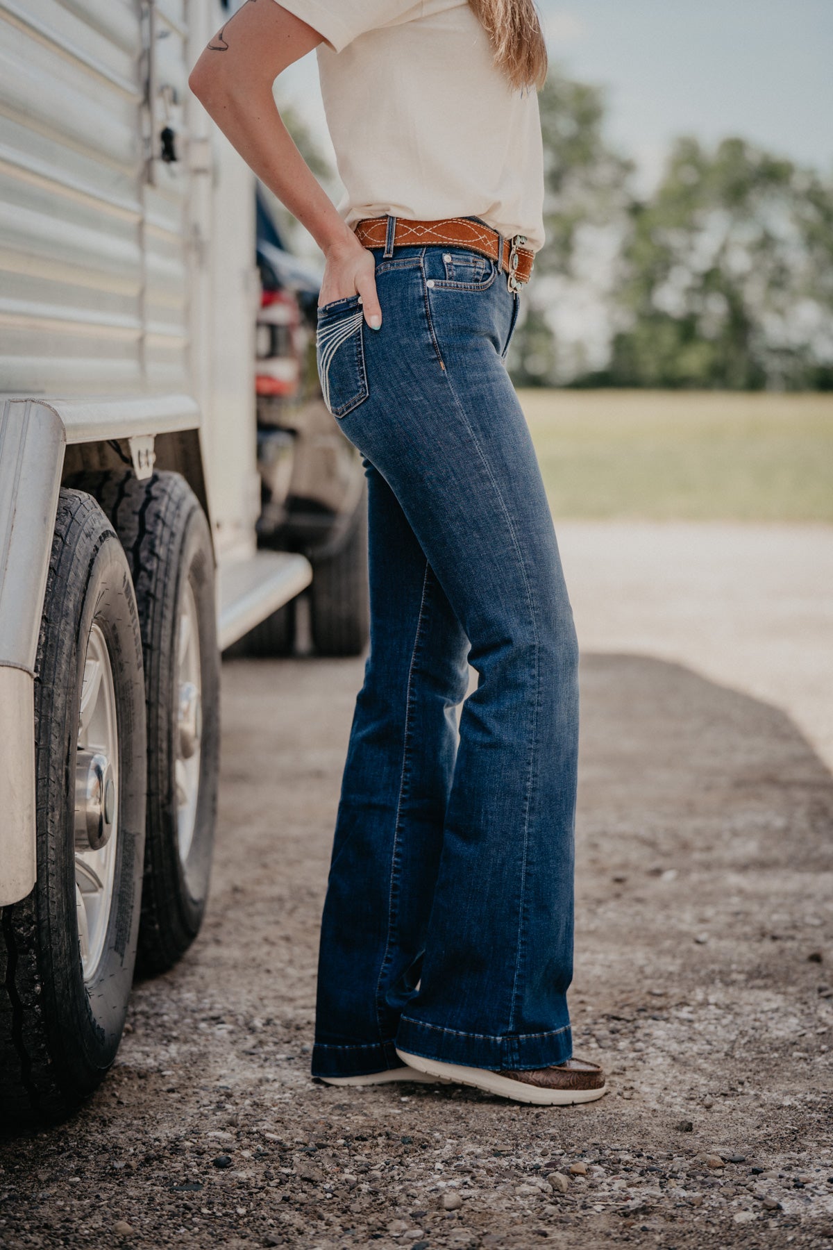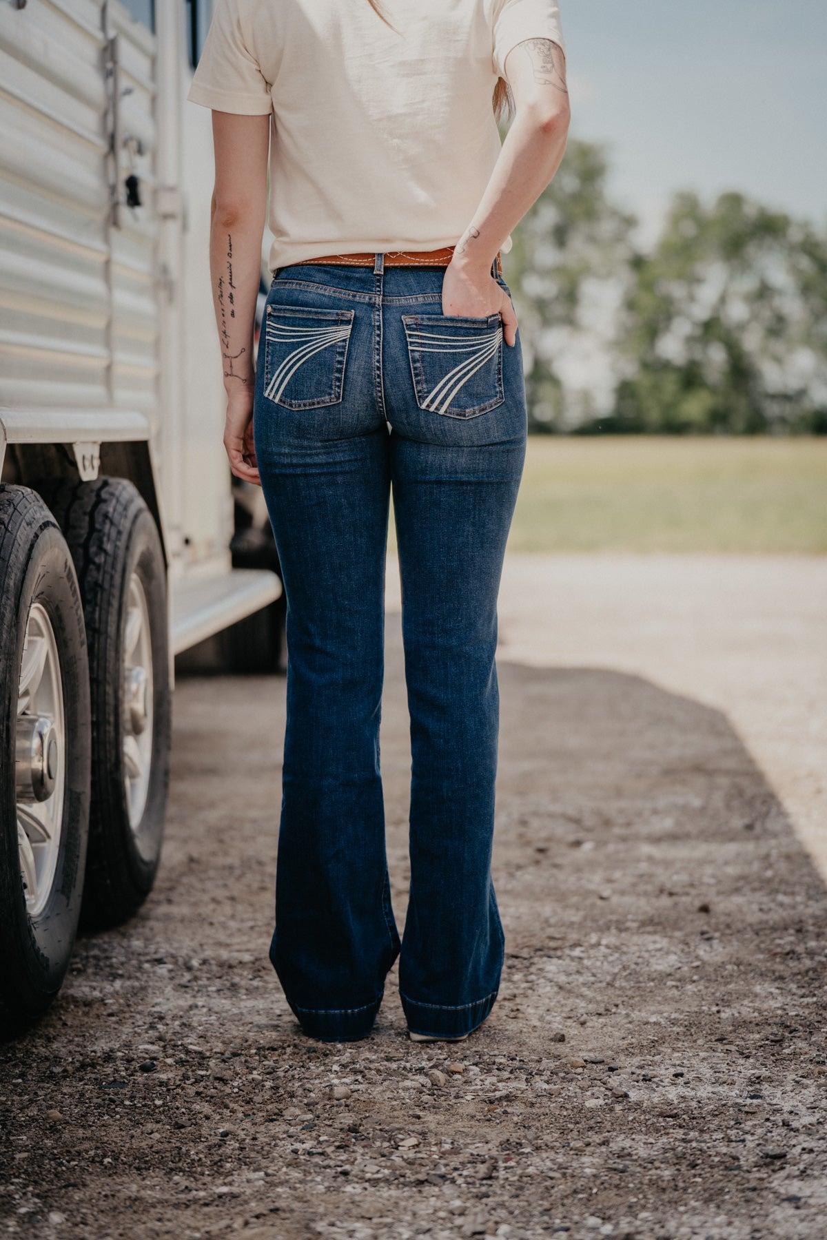 We absolutely love our Dojos around here and had to bring in another super buttery soft 7FMK Dojo trouser style for you! These new dark blue wash trousers are so comfortable and stretchy, they don't even feel like jeans, trust us on this one... we live in these! Such impeccable quality, style and flattering fit, these Dojos will be a favourite. The Dojo style is a medium-high waisted flare with cuff, with a slimming fit through the bum and thighs. The standard 34" inseam on these are perfect for everyday wear, dressing up with booties, to wear in the saddle and everything in between.