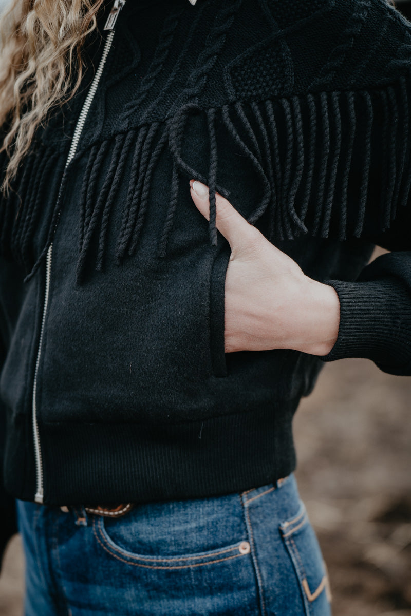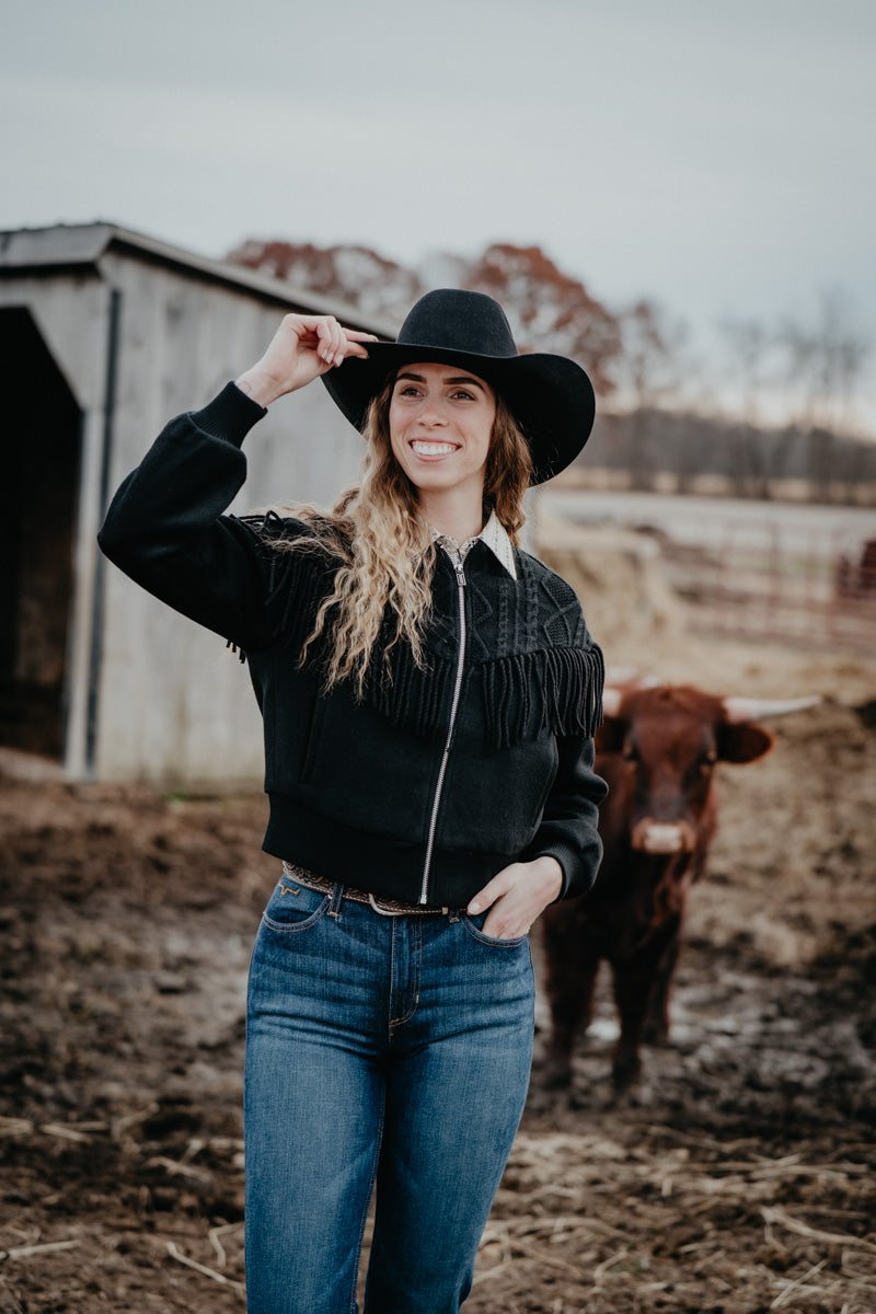 This unique bomber style jacket from Ariat features a blend of textures - from the gorgeous cable knit style yoke, to the fringe detail - she is an absolute stunner!