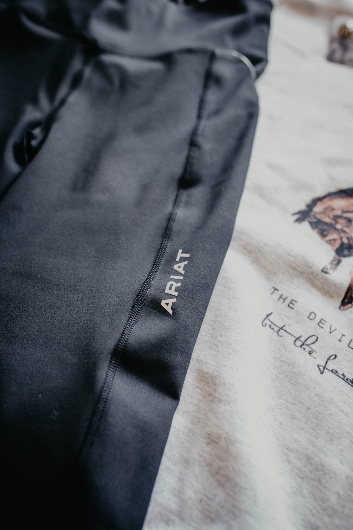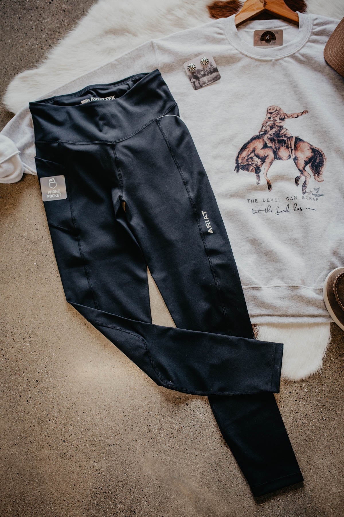 We are so impressed with these new solid black Tek tights from Ariat! From the well thought out design including cell phone hip pocket, fabulous compression fabrication for a flattering fit and guaranteed all day comfort. These will quickly become a favourite for anything from when you are working on achieving your fitness goals, to casual wear.