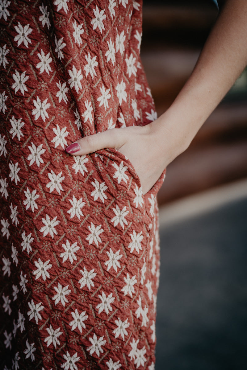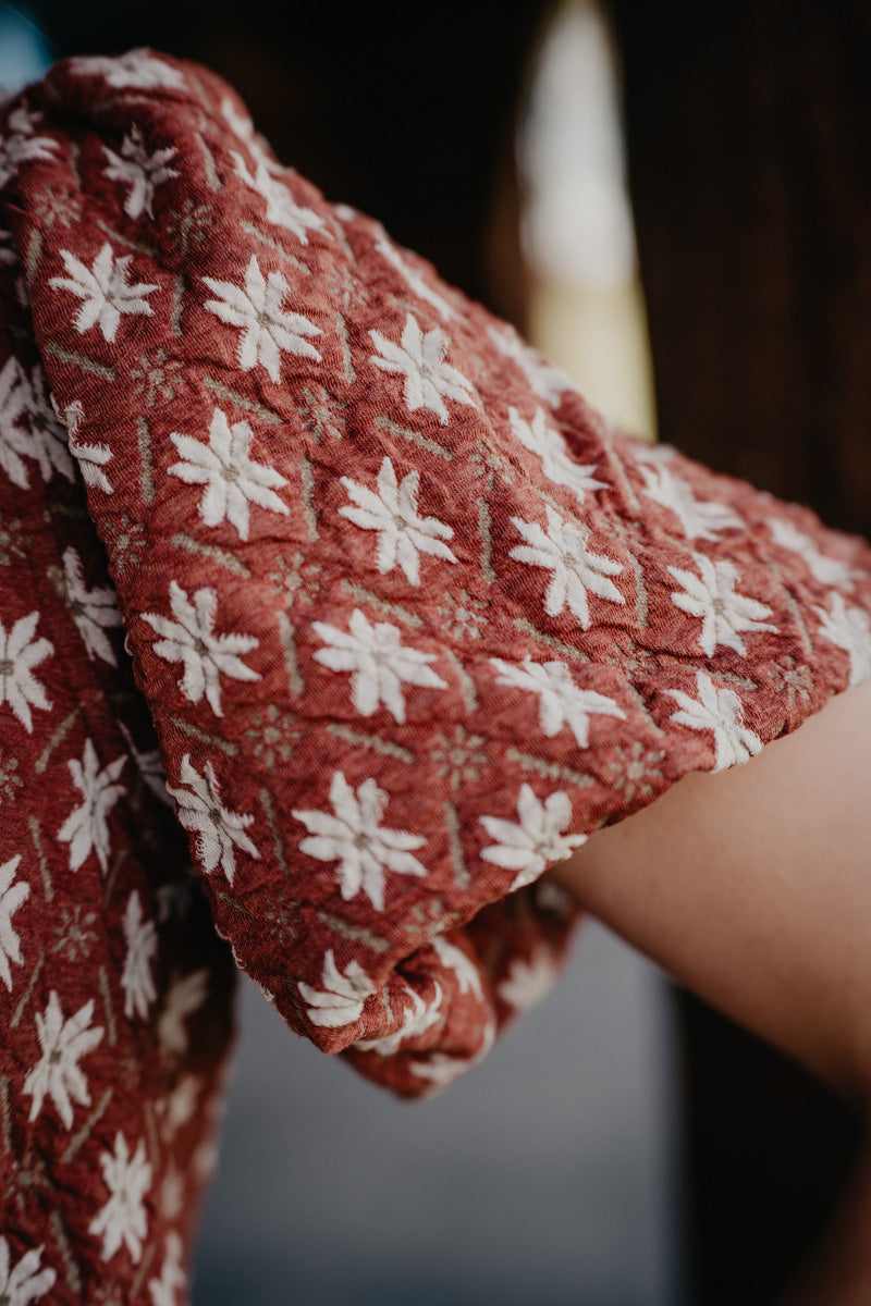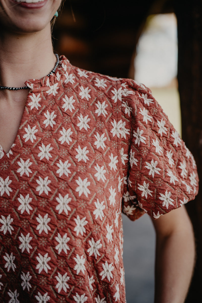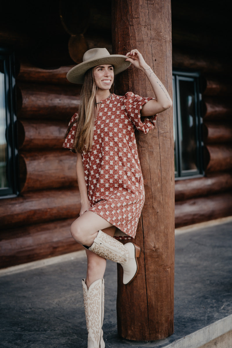 The 'Barbara' mini dress brings a playful vibe with its flattering V-neckline and cute puff short sleeves! Its relaxed boxy fit ensures all-day comfort, while the red rust base adorned with an intricate floral pattern adds a burst of colour and charm to your wardrobe!