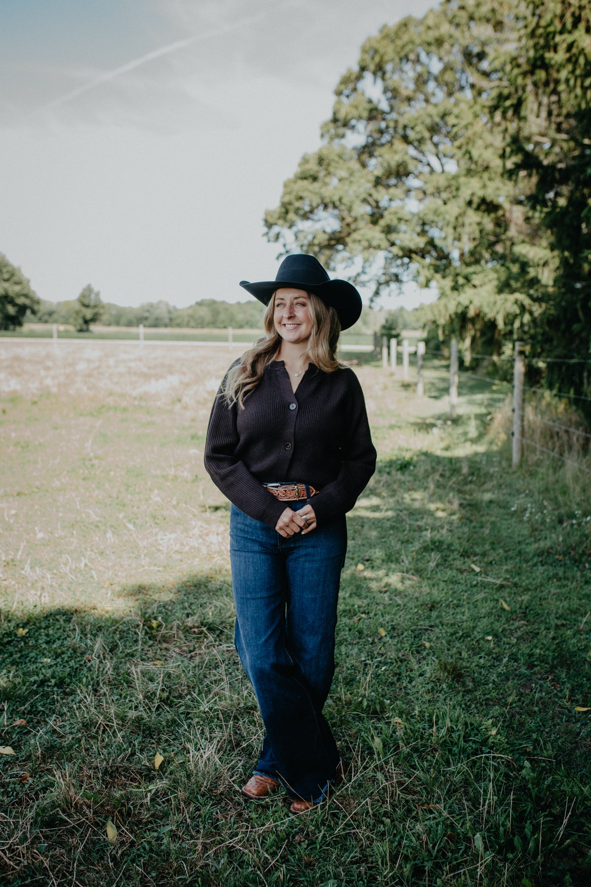Paired with our 'Dark' Wash Olivia wide leg jeans by Kimes Ranch.