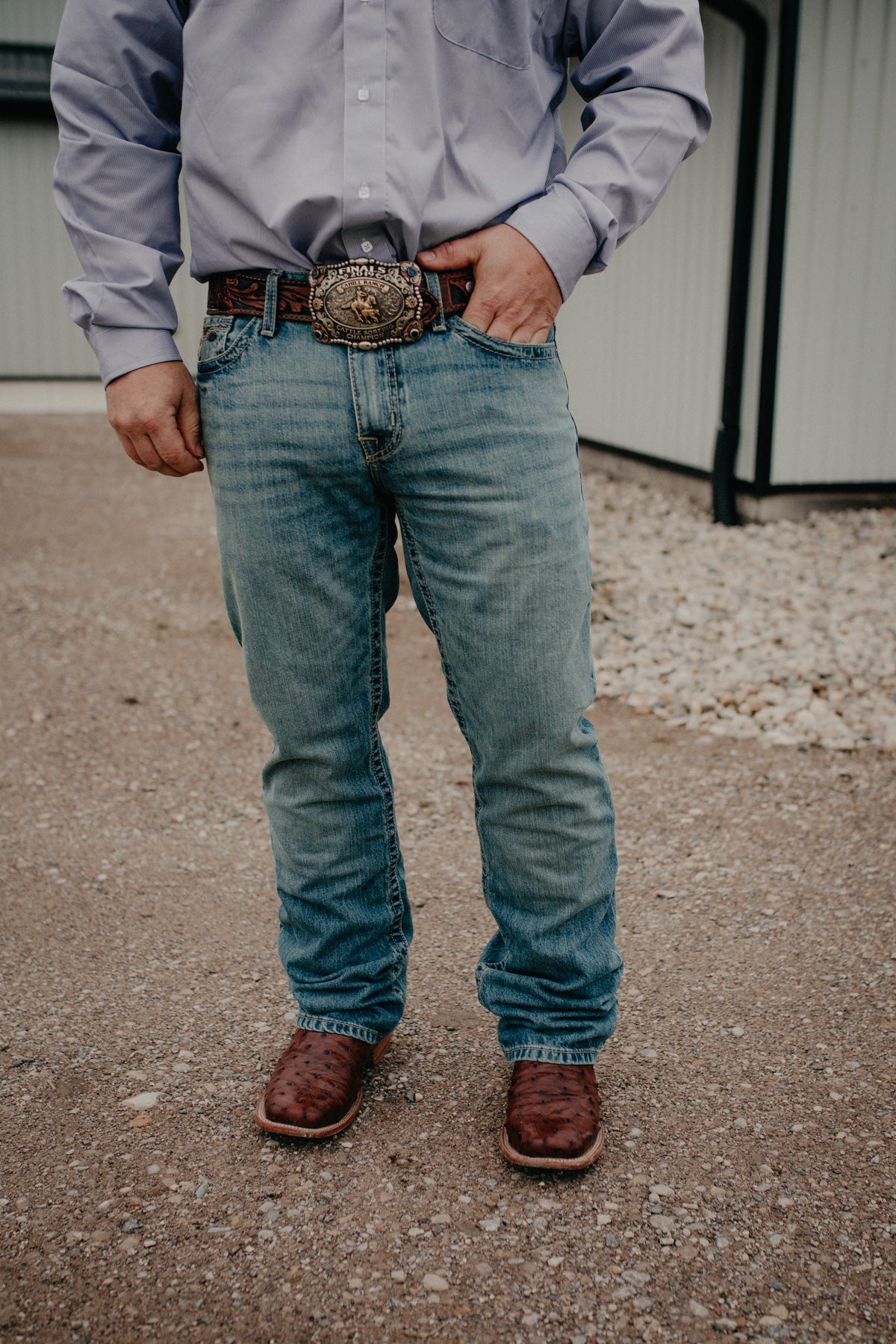 Introducing a new seasonal style of CINCH Ian, a best selling Slim Bootcut. 'Ben' is a classic men's denim featuring a lighter stonewash and chevron pocket styling. Constructed with 13.25 oz. rigid denim, these jeans are both durable and comfortable. Light wash jeans are trending hard in the western industry - and these are a must have!