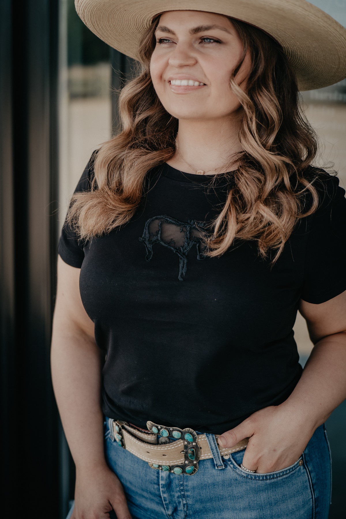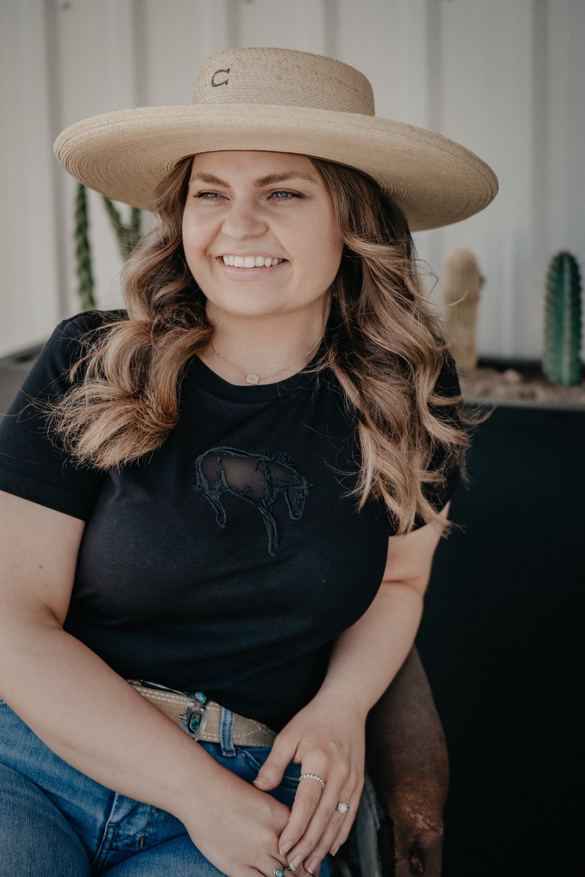 Your classic black tee with a twist -a cutie embroidered bucking horse with a mesh inlay on the chest brings a playful western flair! This t-shirt is versatile enough to match with anything in your closet and is perfect for any season! Pair with denim for that classic 'jeans & a tee' look, or dress it down to lounge around the house with boxers or joggers.