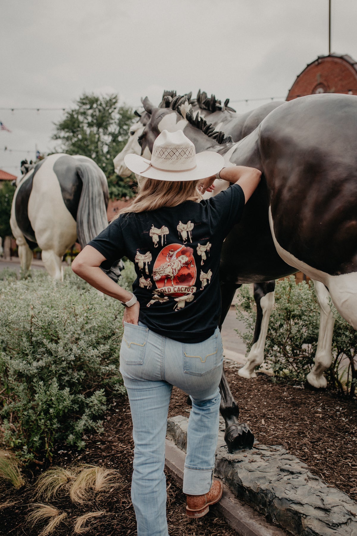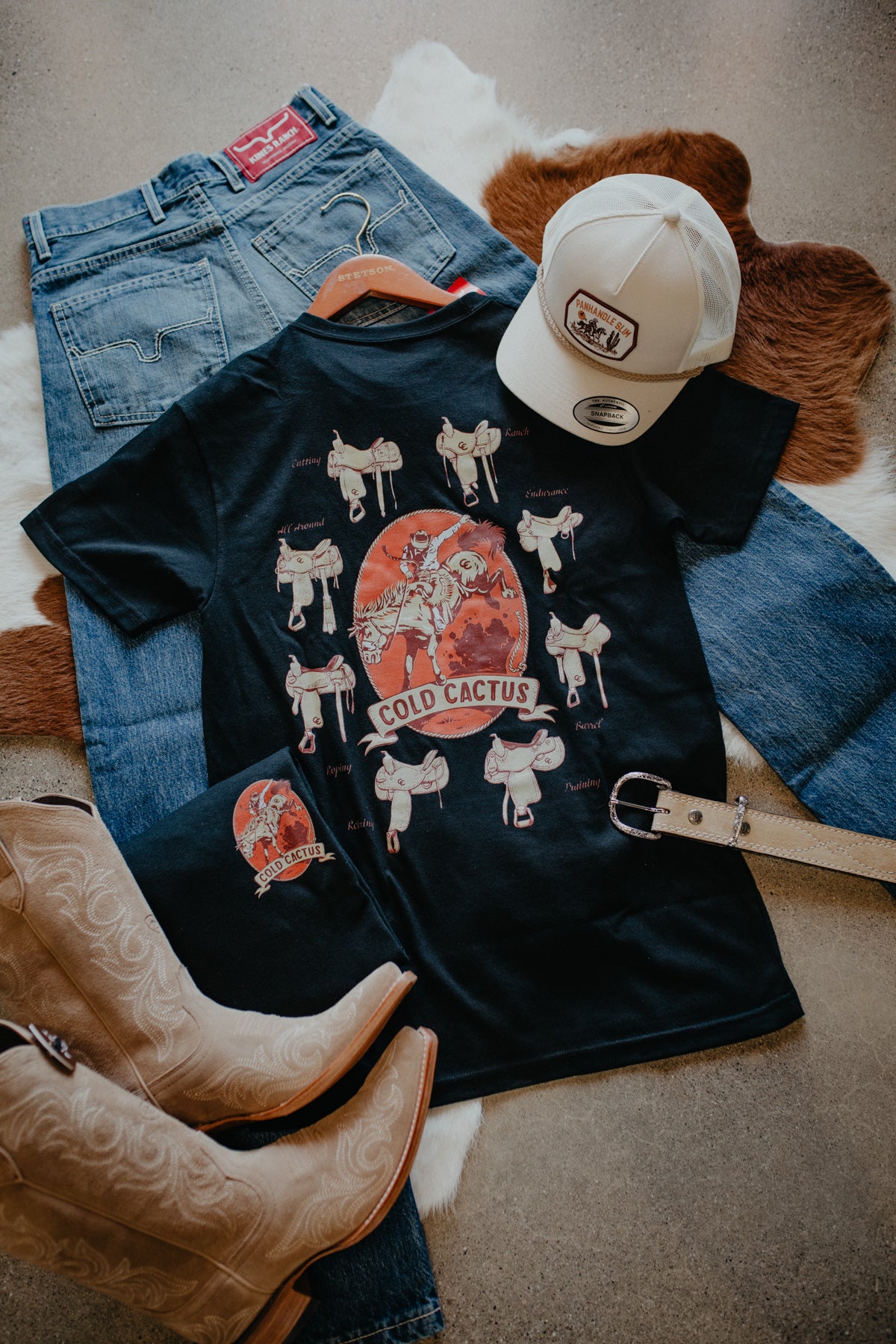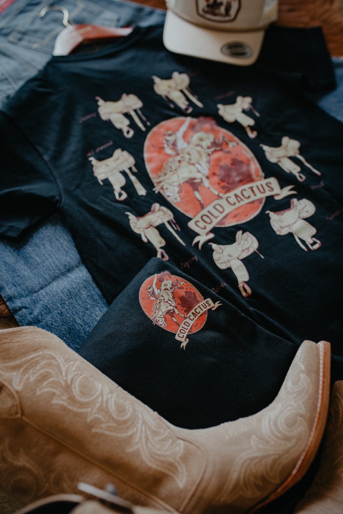Ranchin', Roping', Reining, Cutting - or just for fun - this tee is for all who live and love the western lifestyle! It celebrates the many different western disciplines and corresponding saddle types that shape the western lifestyle. Featuring original artwork of a round up of iconic western saddle styles surrounding a bold bronc ride, this exclusive Cold Cactus graphic reminds us that no matter your discipline, you've got the best seat in the house. We are proud to print this on a unisex fitting, CANADIAN-MADE black graphic T crafted for comfort!