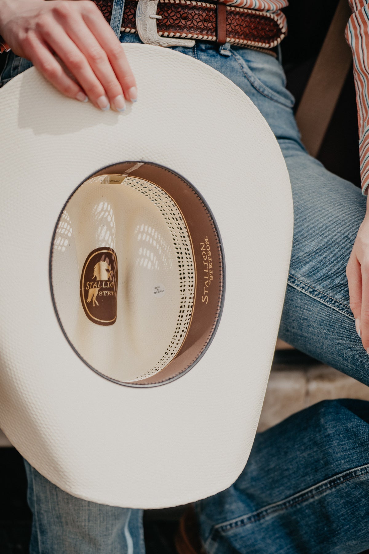 Introducing the Billy Straw Hat by Stetson, a fusion of style and functionality. The fully vented bangora style crown ensures breathability while the brown leather hatband, scalloped by rawhide strings and silver diamond conchos, adds a touch of luxury. Stay cool and sophisticated with this premium hat.
