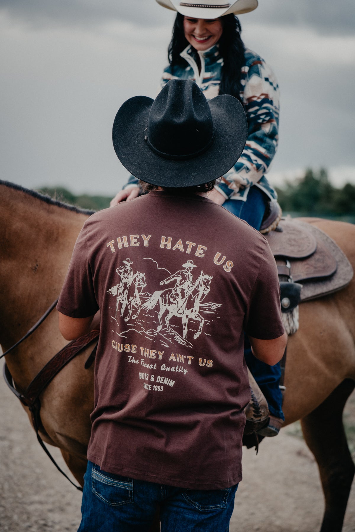 For the cowboys who ride their own trail, this Ariat tee has a chest logo up front and a bold back graphic of cowboys on horseback with the words “They Hate Us ’Cause They Ain’t Us.” Rugged, comfortable, and built for everyday wear - pair it with your favourite denim and boots, or throw it under a jacket when the fall air rolls in.