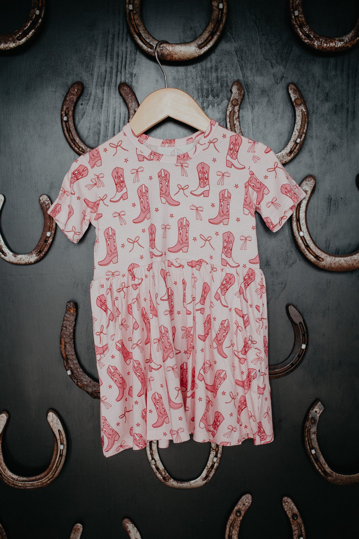 Buttery soft fabric and adorable 'Boots and Bows' pattern makes this bamboo based toddler dress perfect for your little cowgirl! Breathable and stretchy, this dress is perfect for Spring and Summer wear!