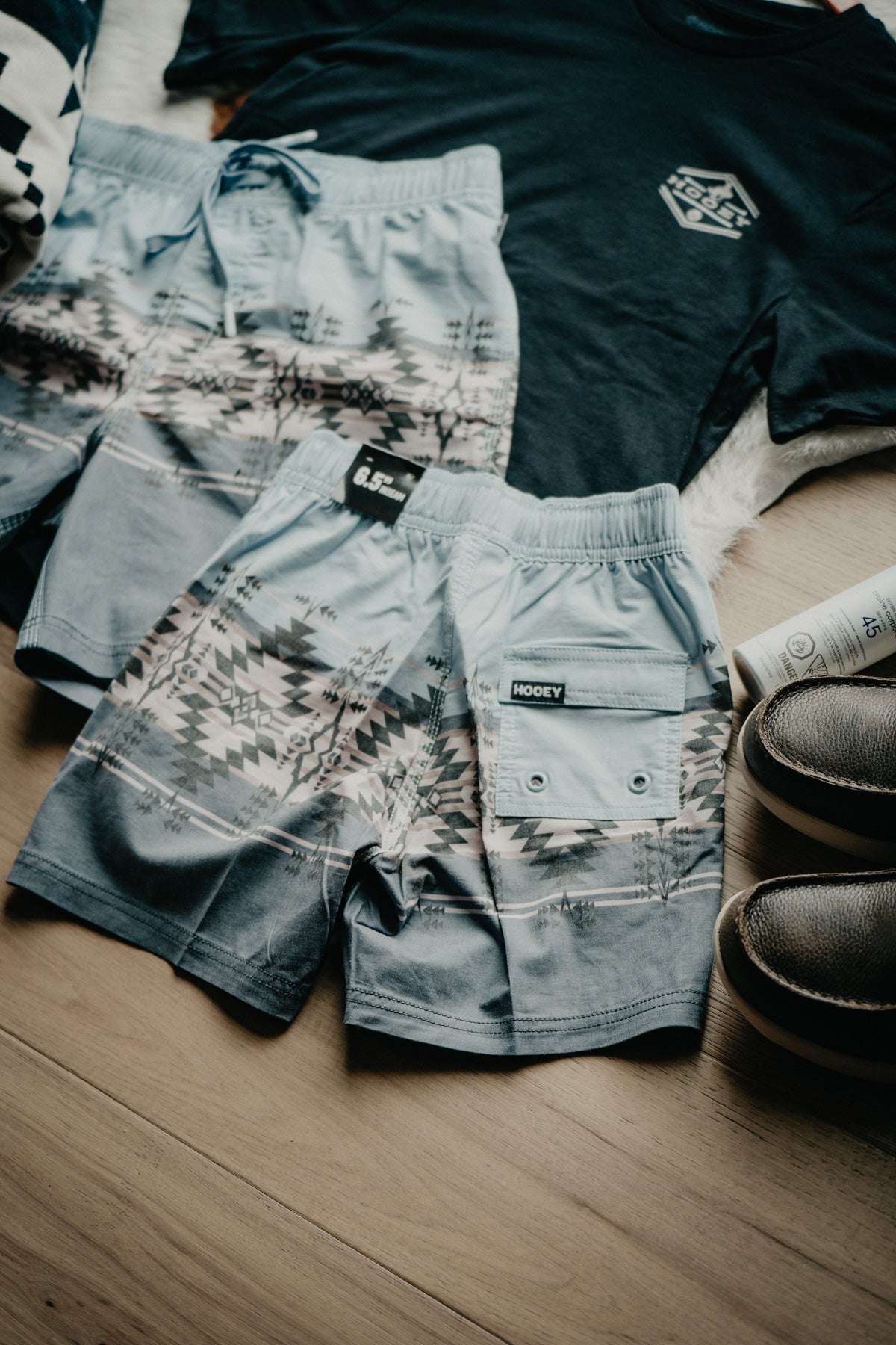 Make a splash in these fun western inspired blue aztec printed boardshorts by Hooey! All the features you need in a staple pair of swim trunks, these will be a favourite all Summer long!