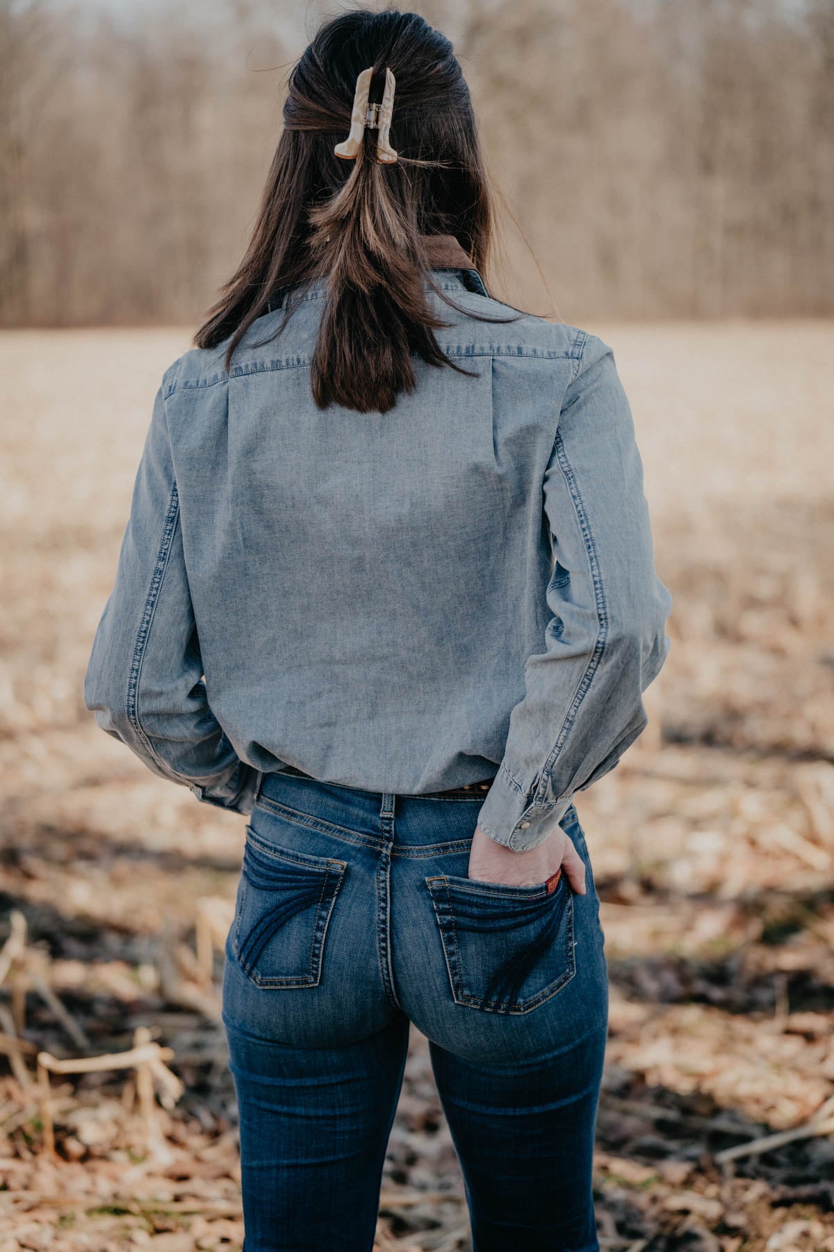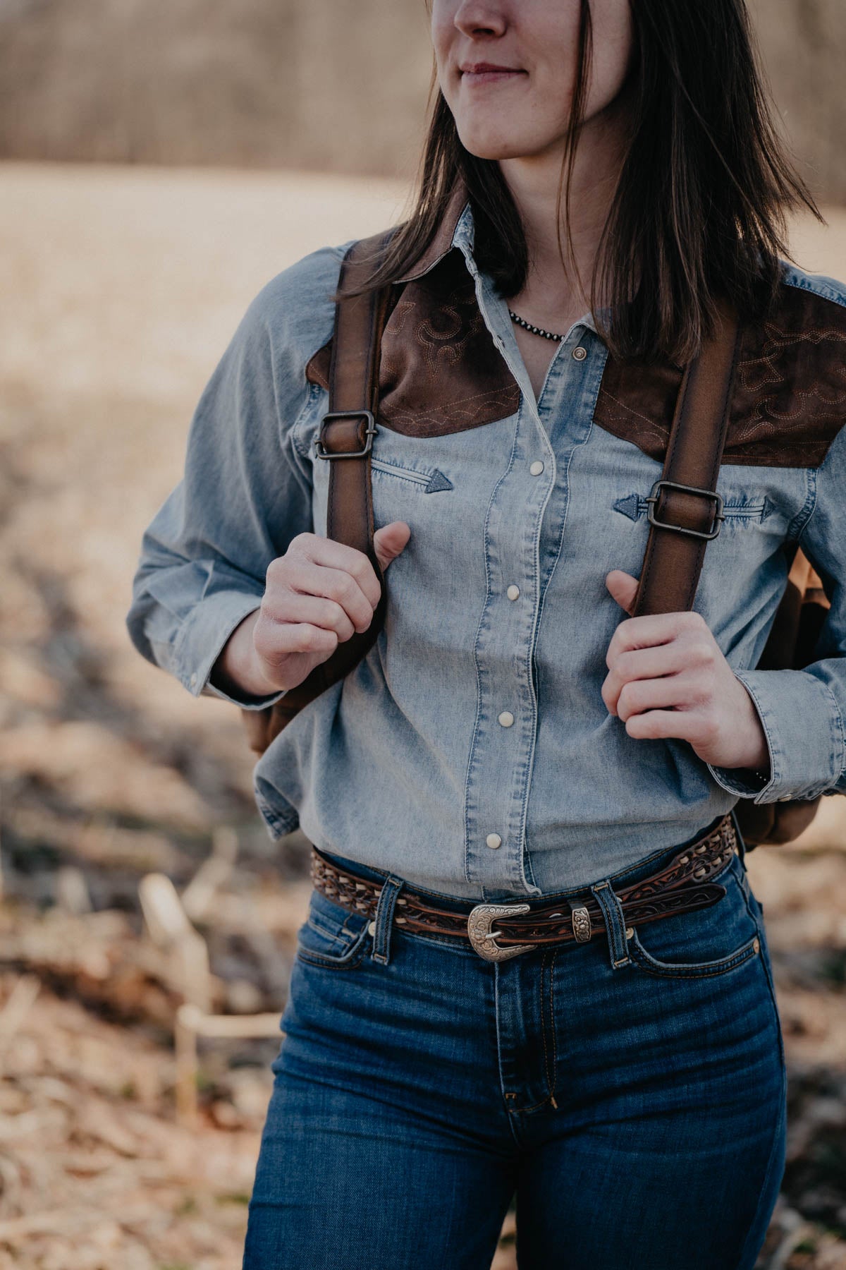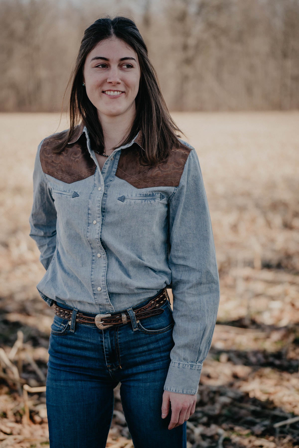 Gracie is shown in 7FMK Melrose 34" Dojo Jeans, a Skinny Brown Vintage Belt by Double J Saddlery and Ariat R toe Brown Distressed Dixon booties.