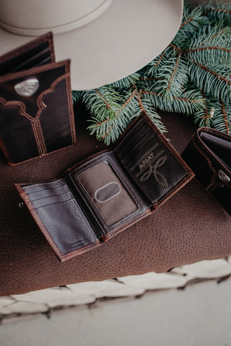 Saddle up your cash with the 'Bump Shield' Ariat Leather Wallet—where durability meets style. Crafted from rich dark chocolate leather with an iconic silver Ariat logo, choose your perfect fit: a sleek wallet/checkbook cover, a classic trifold, or a removable passcase wallet. Every option includes an ID window for quick access!
