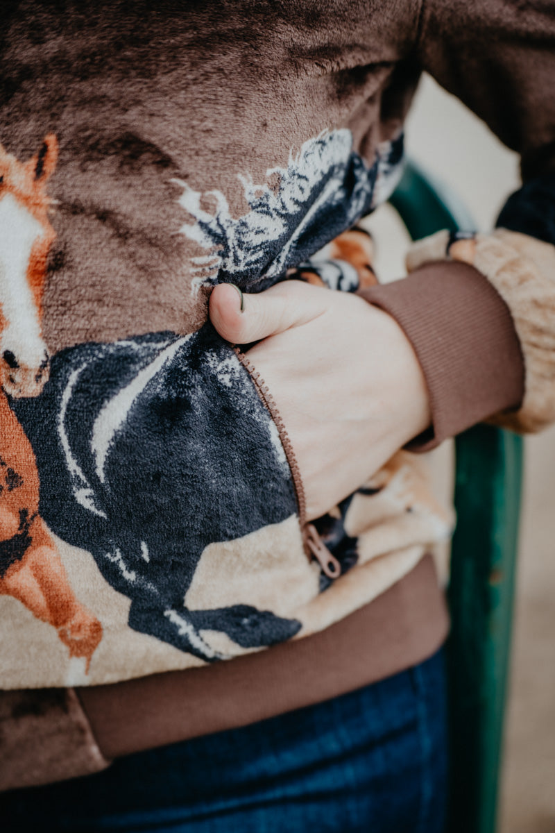 Meet your new favorite layer, 'Carol-Lynn's Closet' Vintage Staple Full Zip! This chocolate brown full zip velour-like showcases a charming horse print that circles the entire bottom of the garment, bringing vintage vibes with a modern twist. The ultra-soft fabric feels amazing against your skin, while dual zip hip pockets keep your hands warm and your essentials within reach. From casual hangouts to outdoor adventures, this playful piece works hard to keep you comfy and stylish!