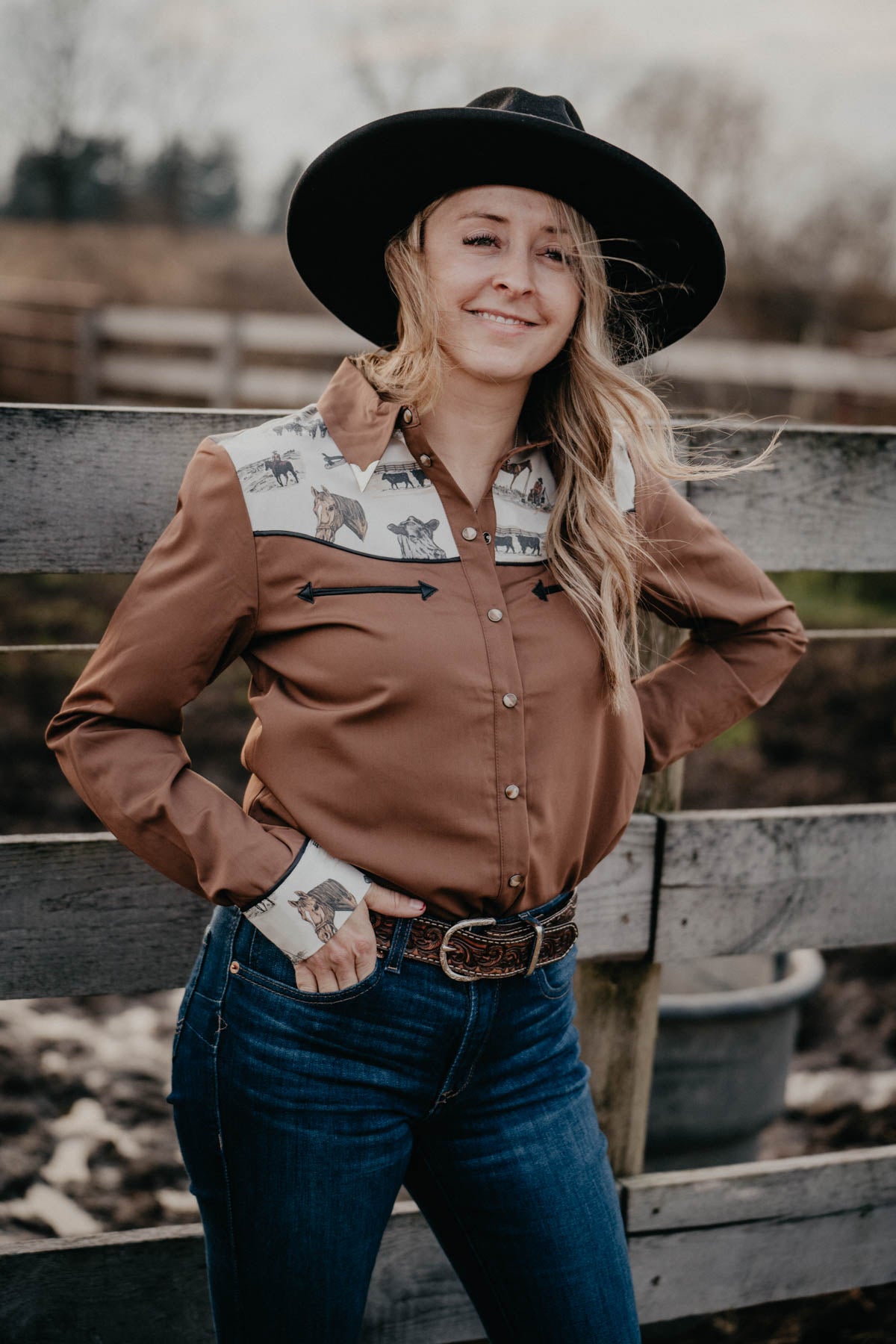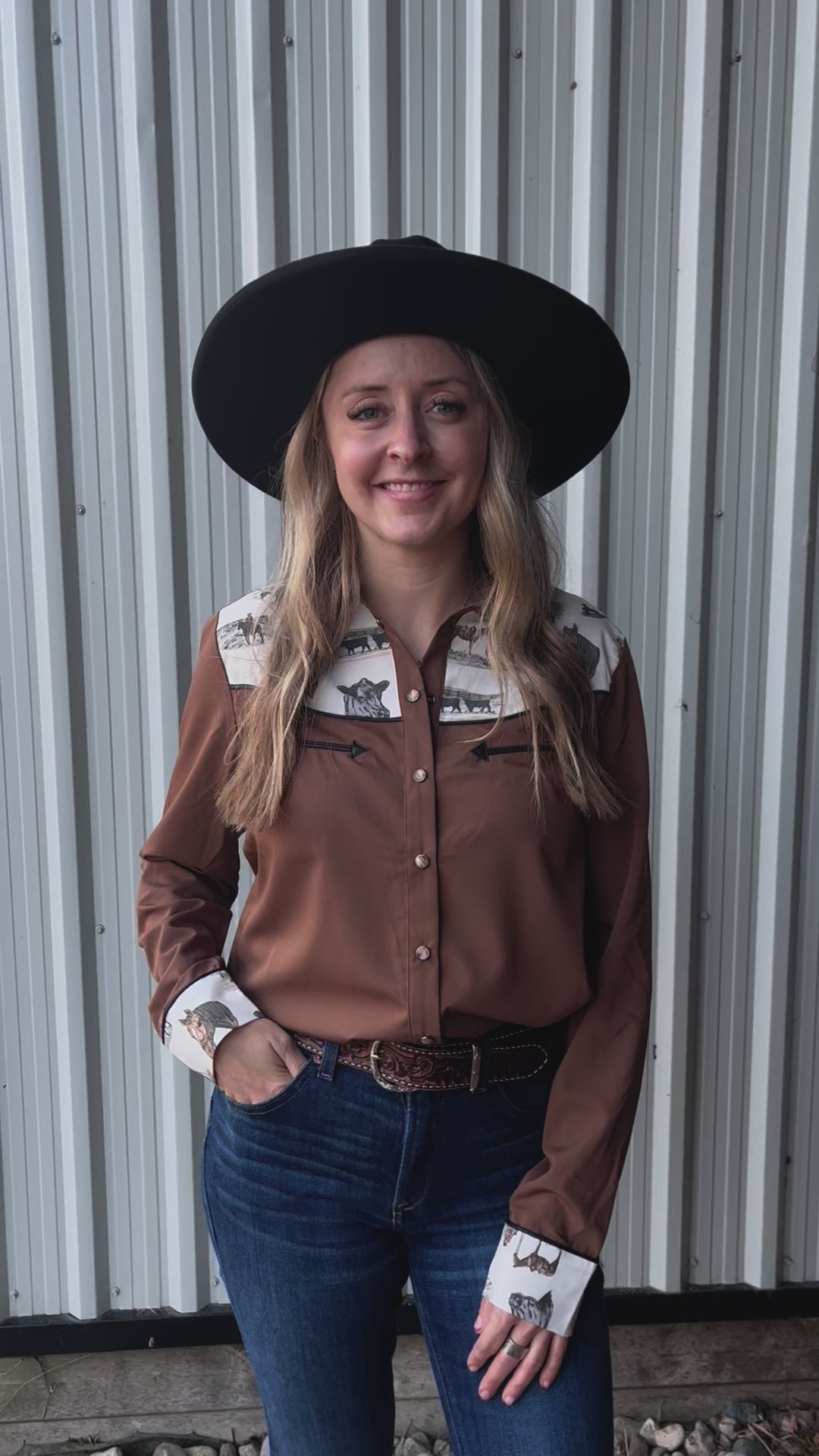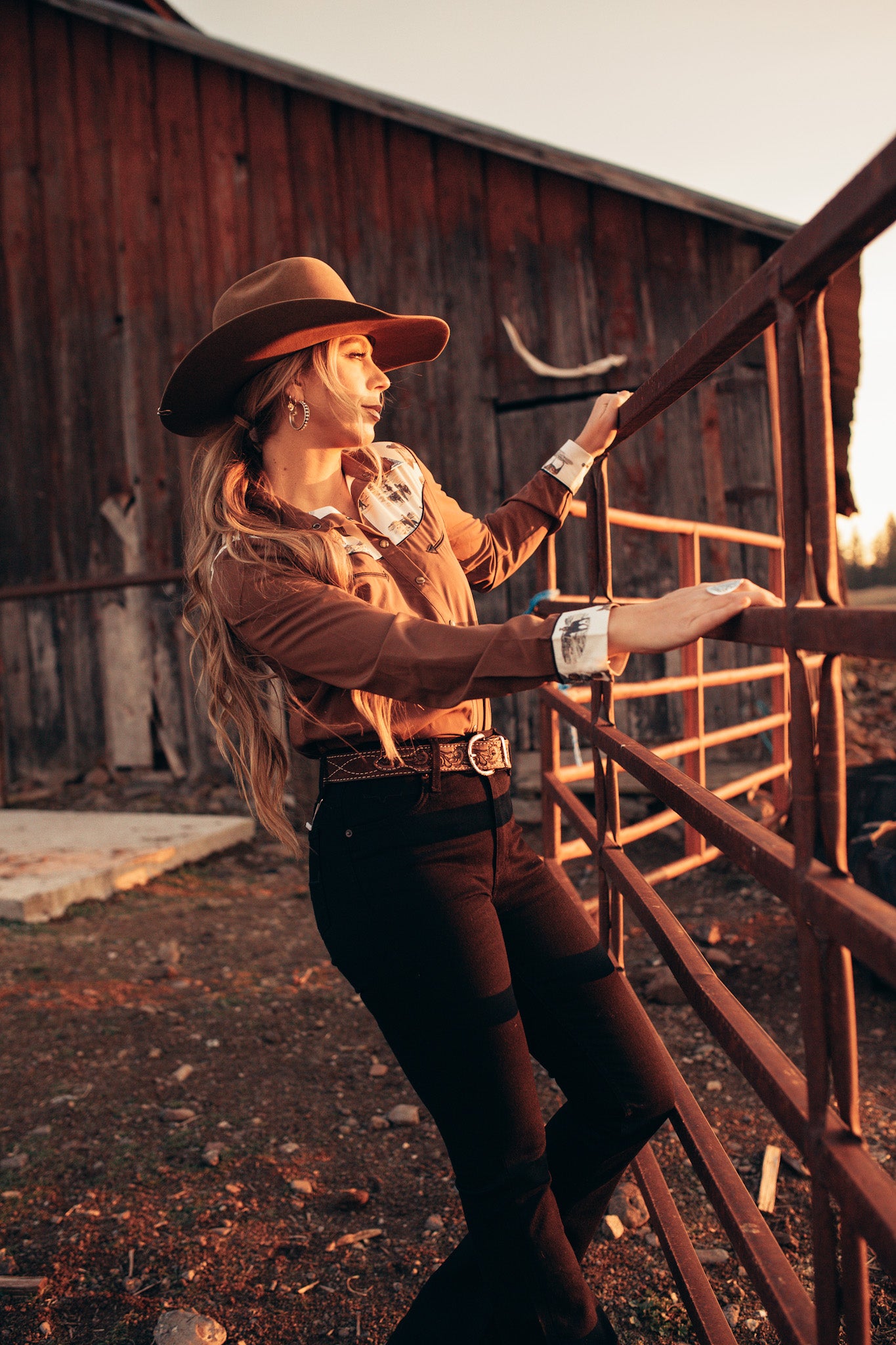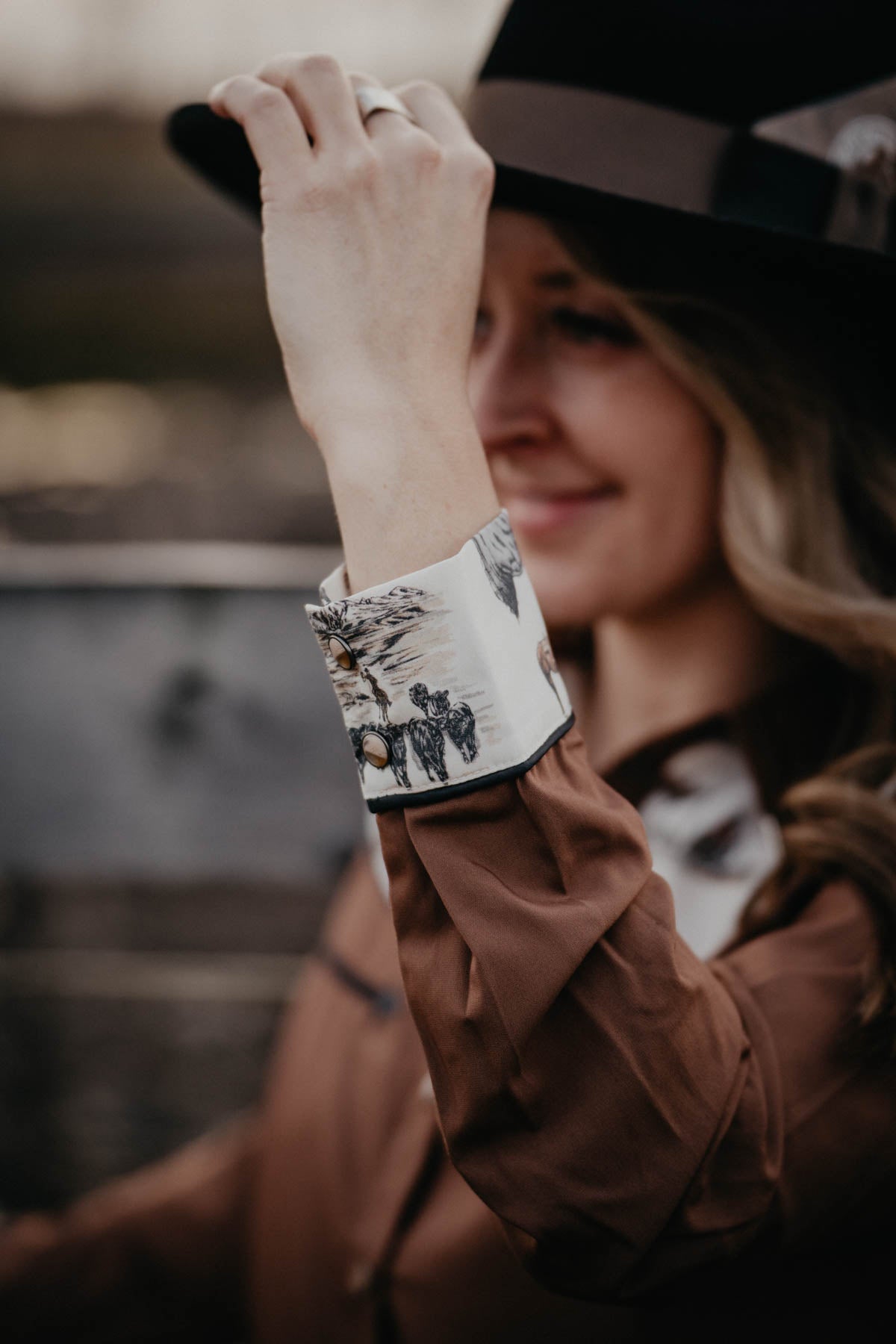 The name for this beauty 'Sorrel Creek' is inspired by the historical farming and ranching community in the Canyon Lake rural settlement area of Texas. With beautiful dark brown clay, Oak and Ashe Juniper woods and a classic rich landscape, we found this to be a great fitting name for our gorgeous new pearl snap. We are so excited to finally share this little secret exclusive with you, it took endless hours of dedication and creativity to make the dream come true on this one-of-a-kind piece. With a deep rich brown colour, Cold Cactus exclusive pattern printed yoke and cuffs, along with faux silver accent on the collar tips, smiley chest faux pocket, and marbled pearl snap details, this is definitely going to be your favourite unique pearl snap! You are going to love the attention to details and soft silky feel of this one, happy shopping!