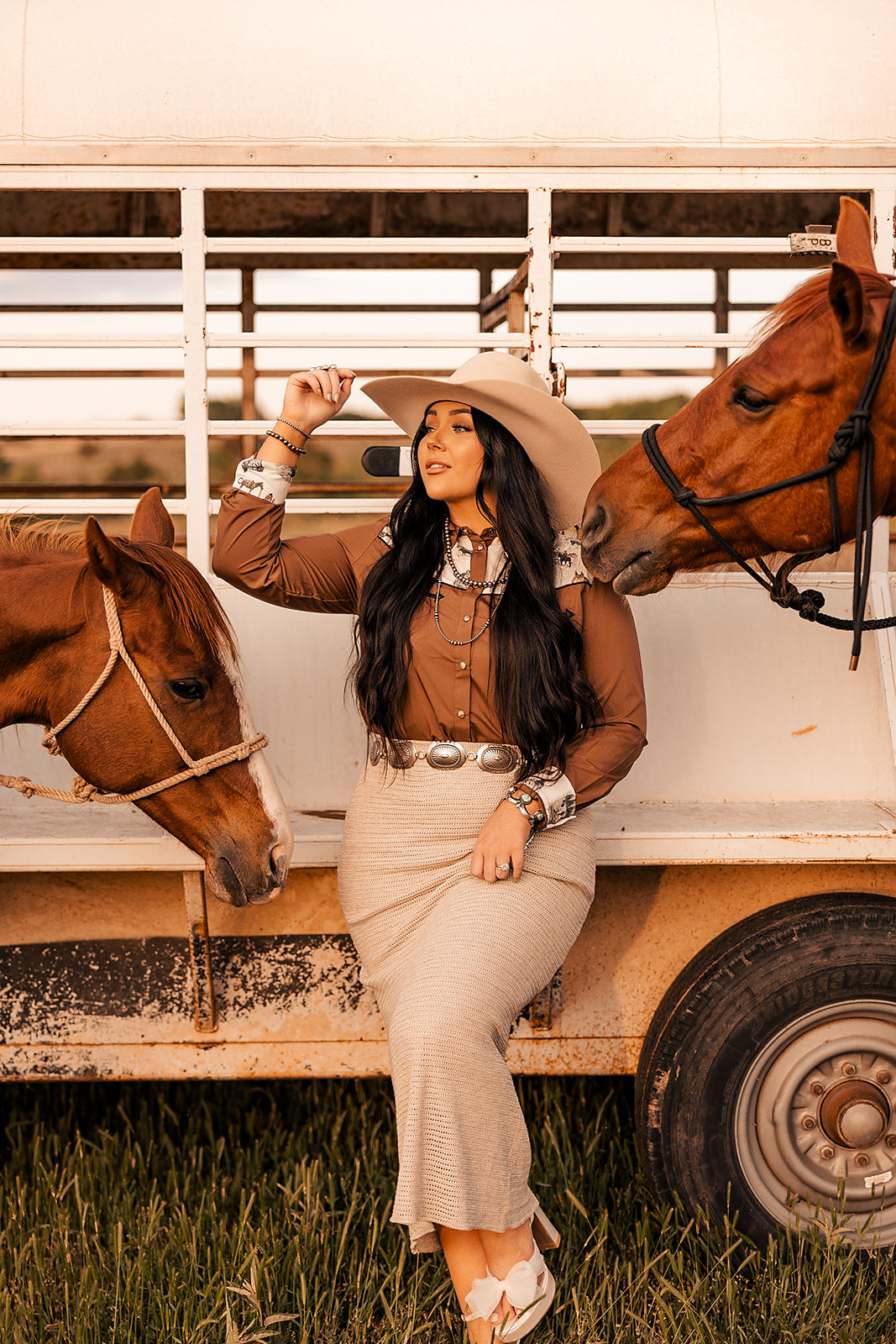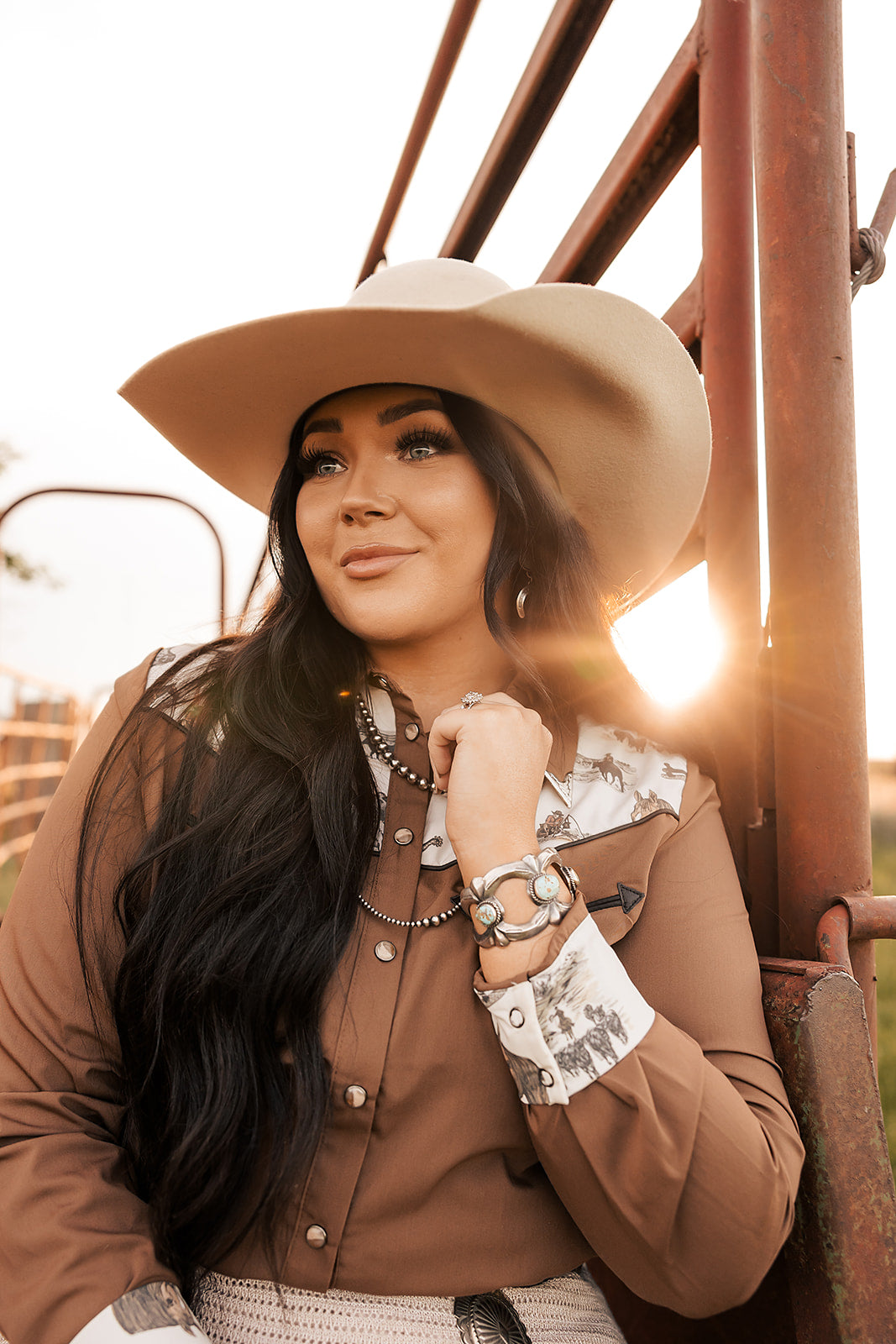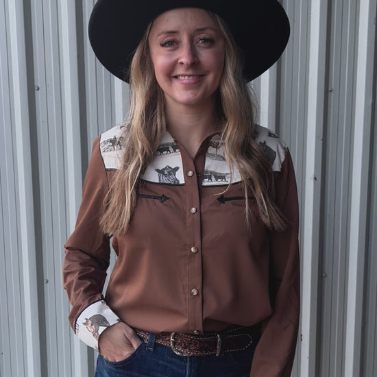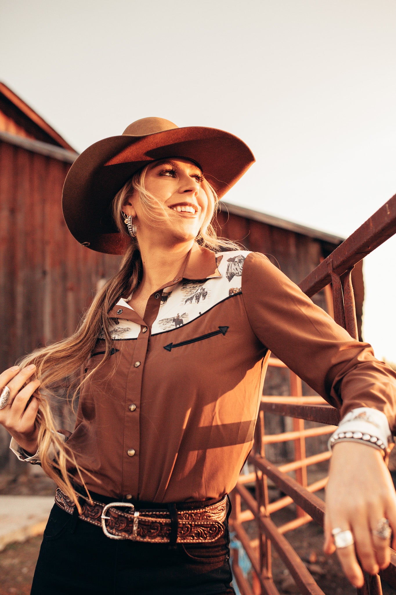 The name for this beauty 'Sorrel Creek' is inspired by the historical farming and ranching community in the Canyon Lake rural settlement area of Texas. With beautiful dark brown clay, Oak and Ashe Juniper woods and a classic rich landscape, we found this to be a great fitting name for our gorgeous new pearl snap. We are so excited to finally share this little secret exclusive with you, it took endless hours of dedication and creativity to make the dream come true on this one-of-a-kind piece. With a deep rich brown colour, Cold Cactus exclusive pattern printed yoke and cuffs, along with faux silver accent on the collar tips, smiley chest faux pocket, and marbled pearl snap details, this is definitely going to be your favourite unique pearl snap! You are going to love the attention to details and soft silky feel of this one, happy shopping!