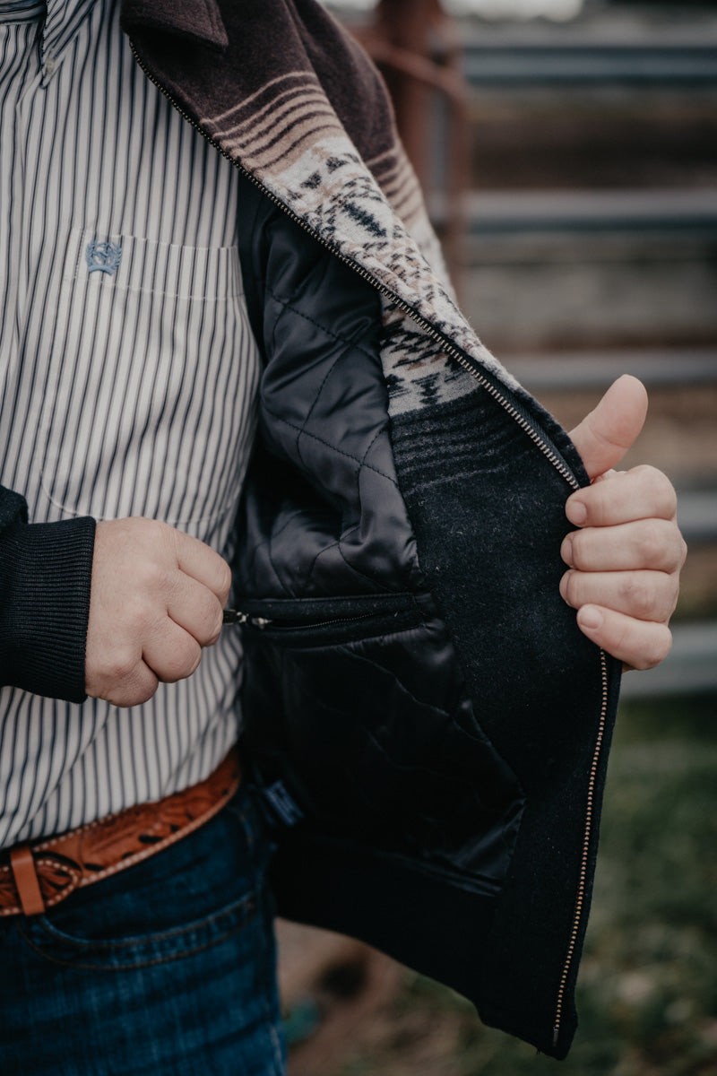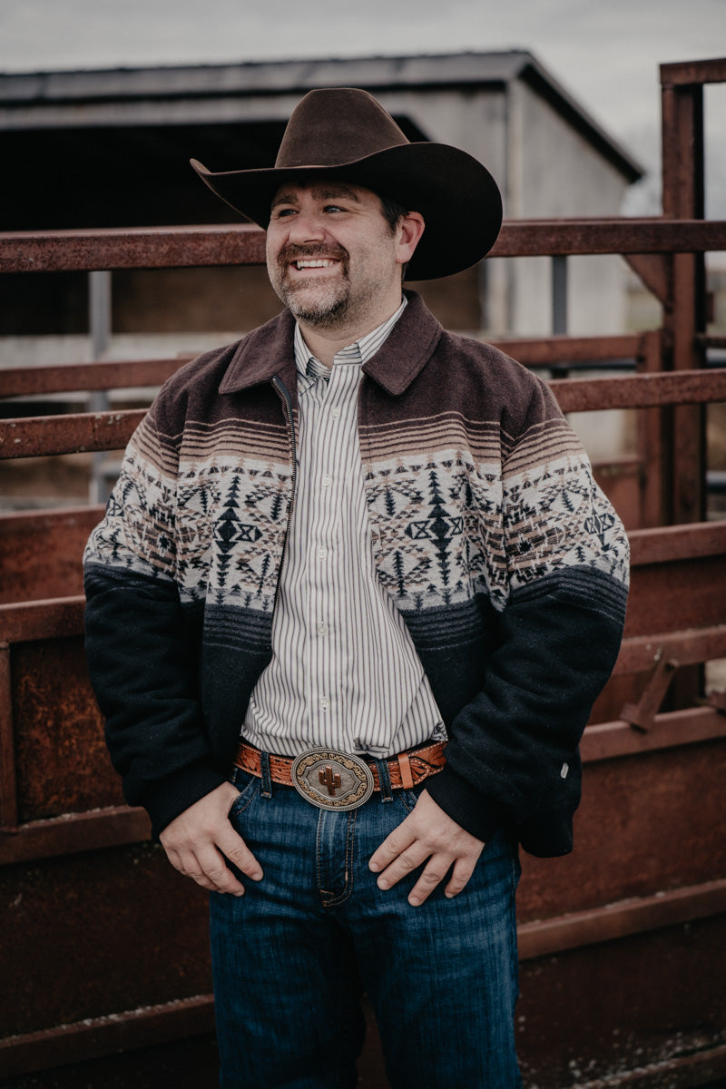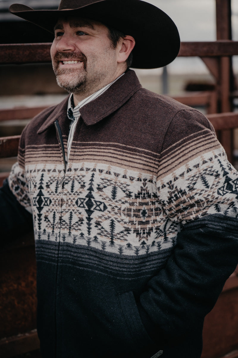 The 'Charles' Bomber brings vintage vibes with a modern edge. This cozy layer features a warm quilted lining perfect for crisp weather, paired with a striking all-over border jacquard print in rich chocolate, tan, and ivory tones. Practical hip pockets keep your essentials close, while the smooth zipper front makes layering effortless!