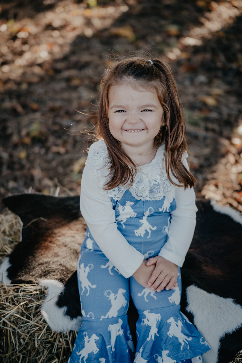 Get ready for fun with the 'Clemintine' bell bottom overalls! Adjustable button straps make dressing a breeze, while ruffle flare bottoms add a lively touch to every twirl. The solid blue fabric is dotted with playful white roper cowgirls, perfect for little trailblazers!