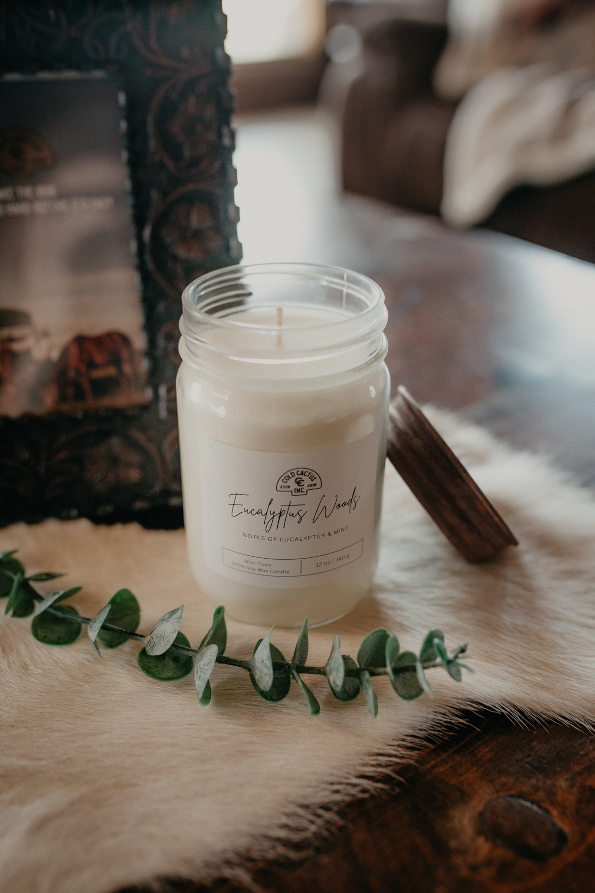 Eucalyptus Woods: Infused with invigorating notes of eucalyptus and mint, this candle transforms any space into a serene sanctuary. Perfect for the cowgirl needing relaxation or rejuvenation, let this soothing fragrance transport you to a tranquil forest retreat.
