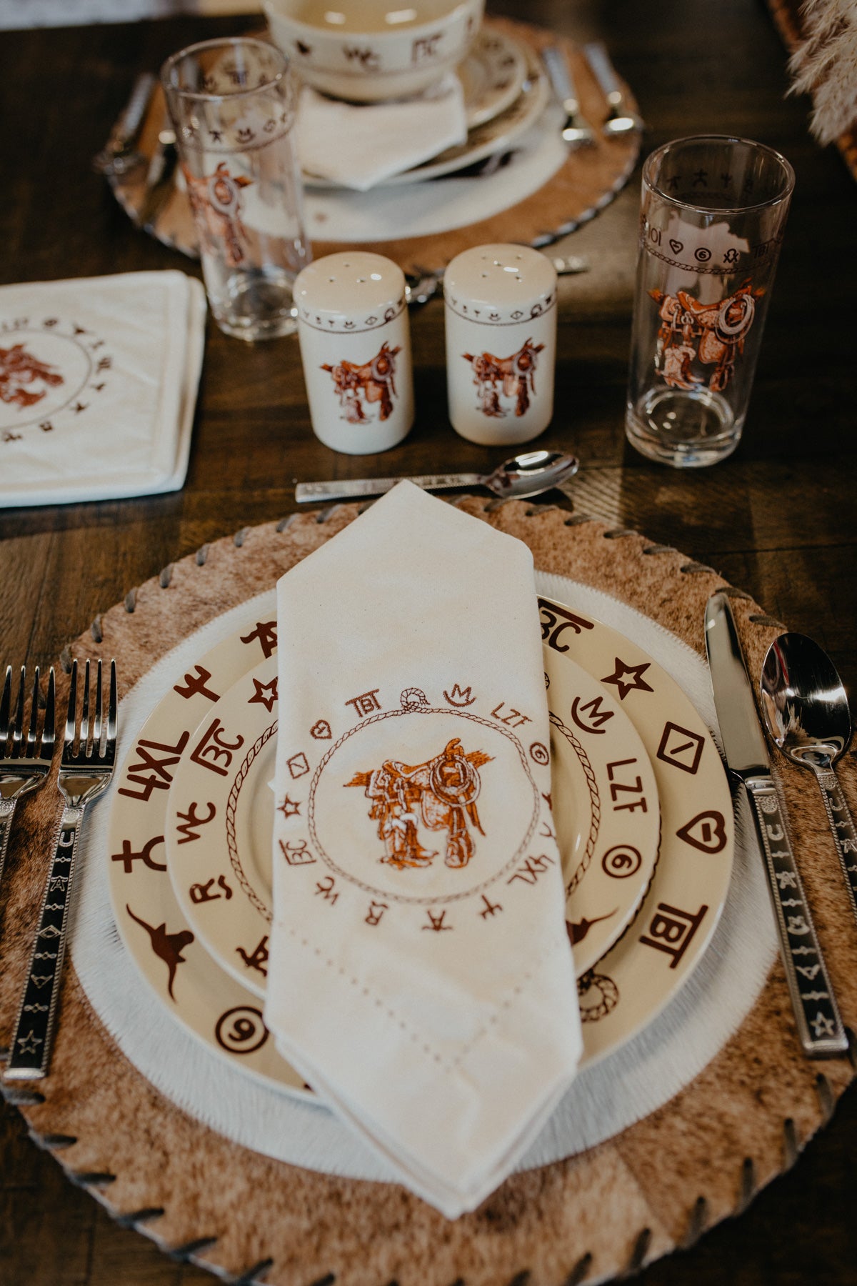 - Ivory base with embroidered saddle design