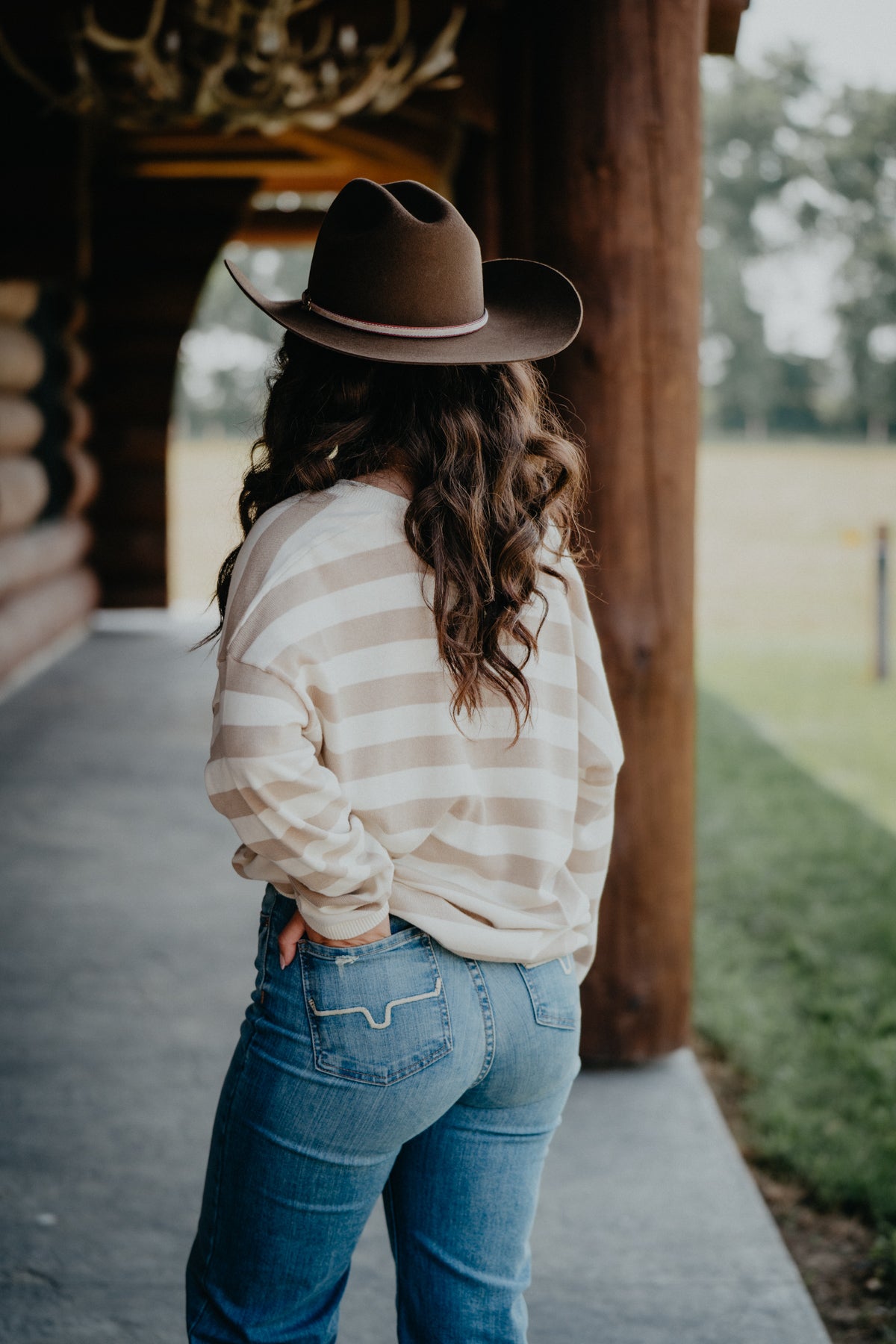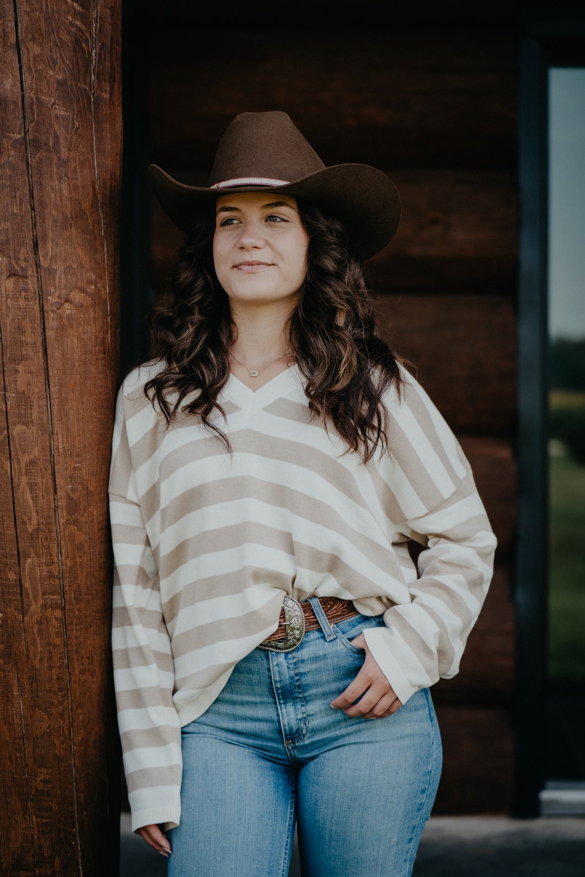 Looking to embrace a cute and cozy vibe this season? Check out the 'Cordella' Lightweight Striped Sweater! This charming piece features a lovely cream base adorned with tan stripes. It’s perfect for keeping you looking stylish all season long!