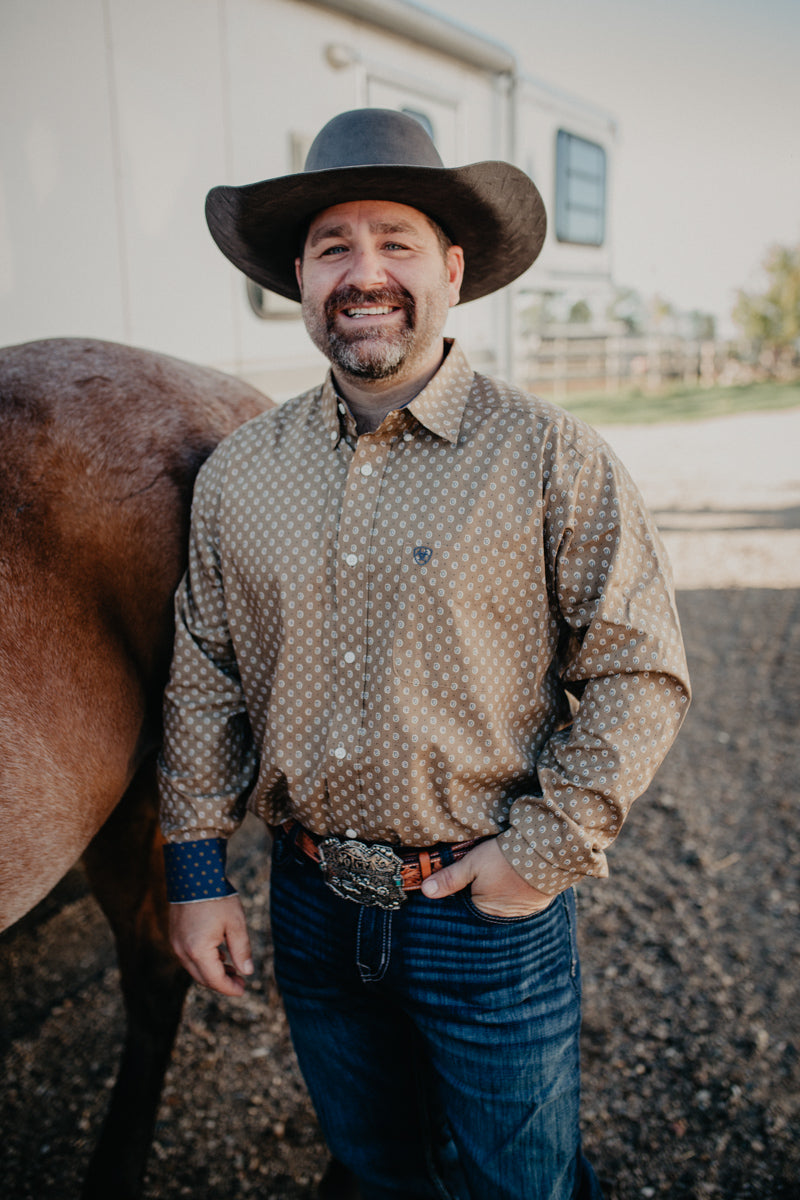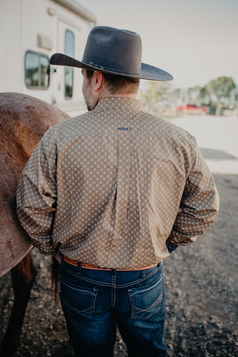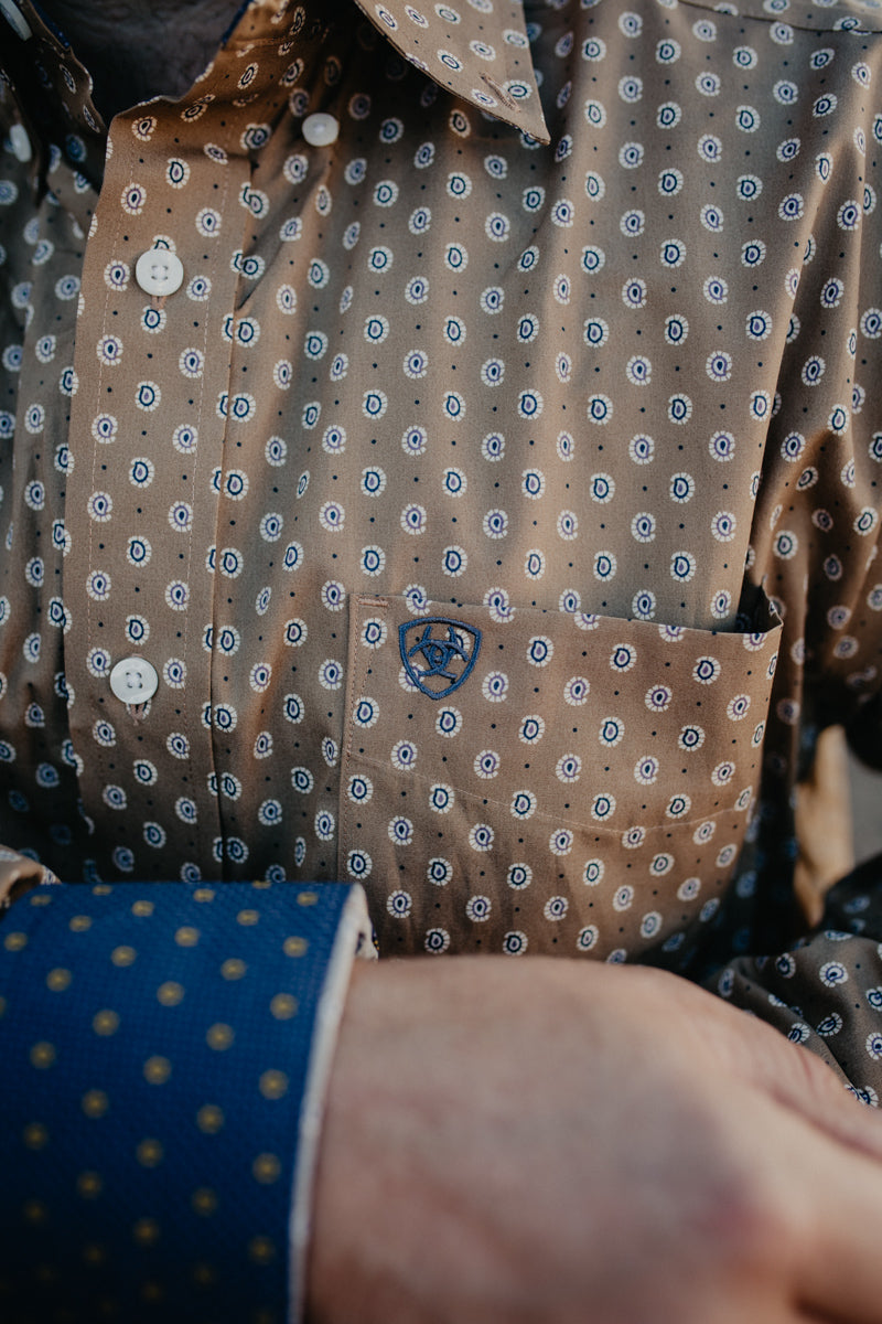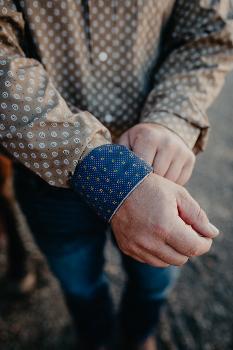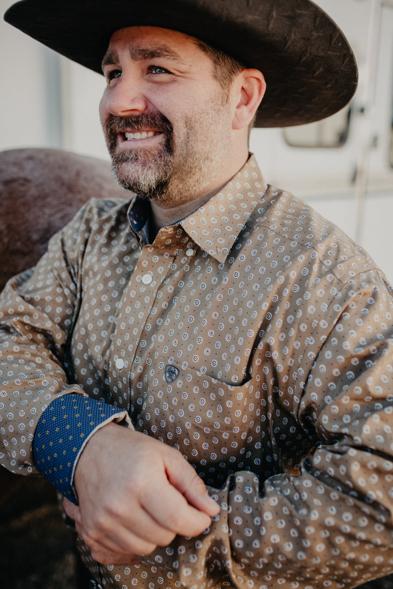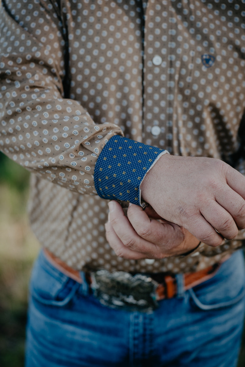 We can't wait for you to add this stunning long sleeve button down to your collection! This tan base shirt has a navy, white mini paisley print with navy contrast cuffs. This shirt has a single chest pocket for convenience. We are loving the wrinkle free fabric perfect for travel or long weekend road trips keeping you looking fresh all day.