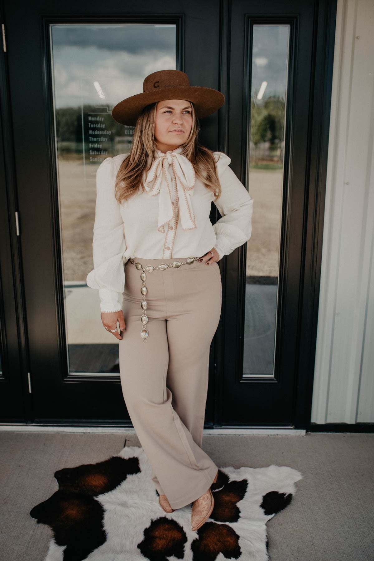 These trouser pants are the perfect blend of comfy and classy! Pull-on style with a stretchy waist band makes these pants perfect for all day wear. Thick material offers a flattering fit while keeping you comfortable on chilly fall days. Pair these trousers with any blouse or button up for the perfect corporate cowgirl look!