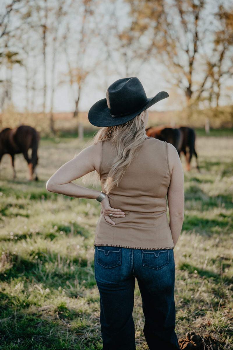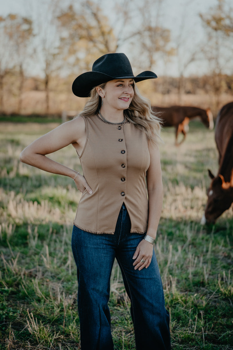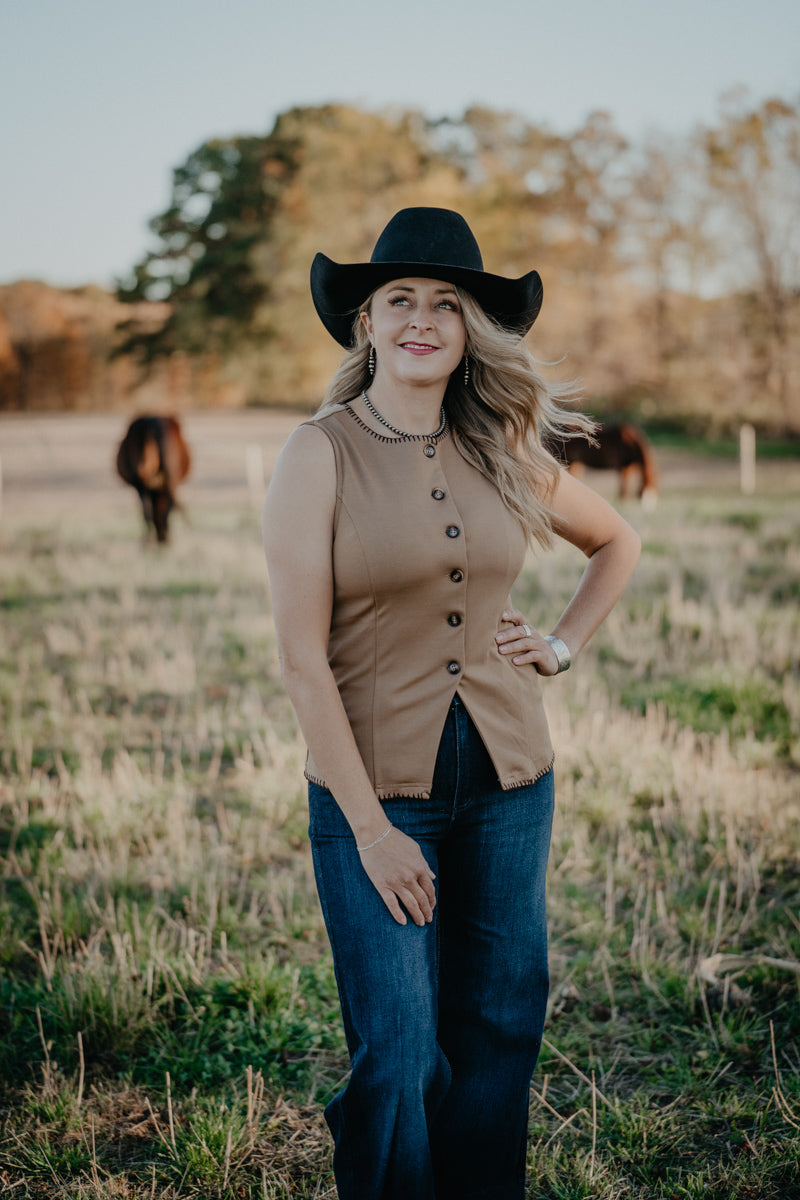 Layer like a pro with this sleek button-down vest featuring a classic crewneck neckline and full button front! The chocolate brown whipstitch trim adds Western flair and visual interest, making it the perfect piece to wear on its own or over a fitted long sleeve layer. Versatile and elevated - this will be a go to favourite for everything from the boardroom, to date night and other dressed-up occasions!