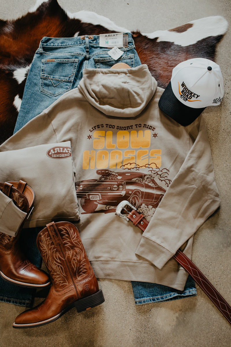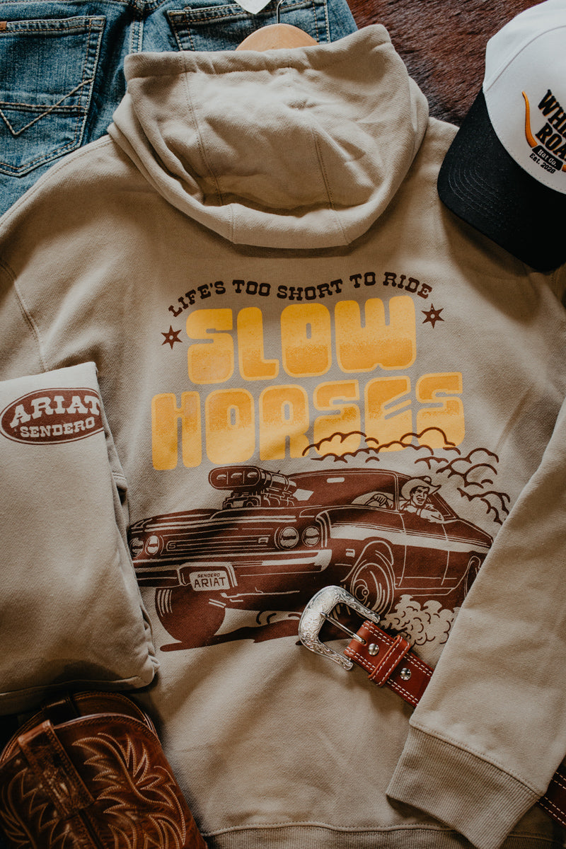 This classic Smoke Ariat Sendero hoodie is the perfect addition to the Sendero Collection and your closet. This hoodie has a classic Ariat Sendero Chest logo and a large "Slow Horses" Back Graphic. This sweater is great for the cooler days ahead.