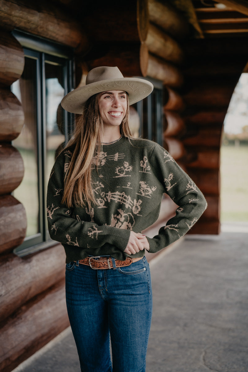 Get ready to lasso compliments in the 'Freeman' Rodeo Quincy Knit sweater. Available in black and emerald, this crewneck sweater features fun and playful designs of cowboys, cacti, and fence lines. The emerald colorway adds a touch of tan to the designs, while the black colorway features white designs. Get your inner cowboy on with this quirky and unique sweater!