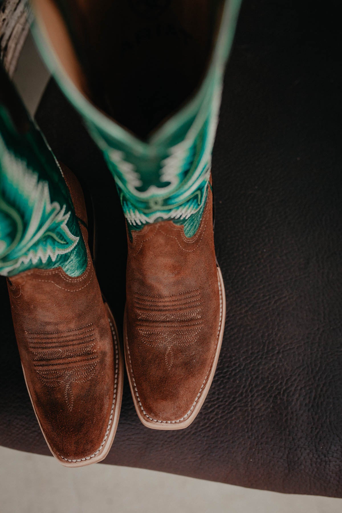 These boots will give 'em something to talk about! Stunning amber brown suede K toe paired with a green metallic 'night vision' upper! Paired with a cutter toe, and the comfort and quality you know and love from Ariat!
