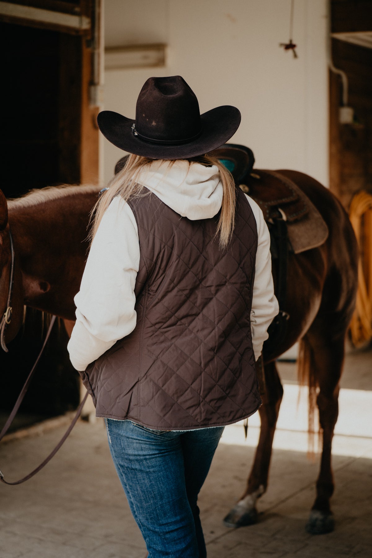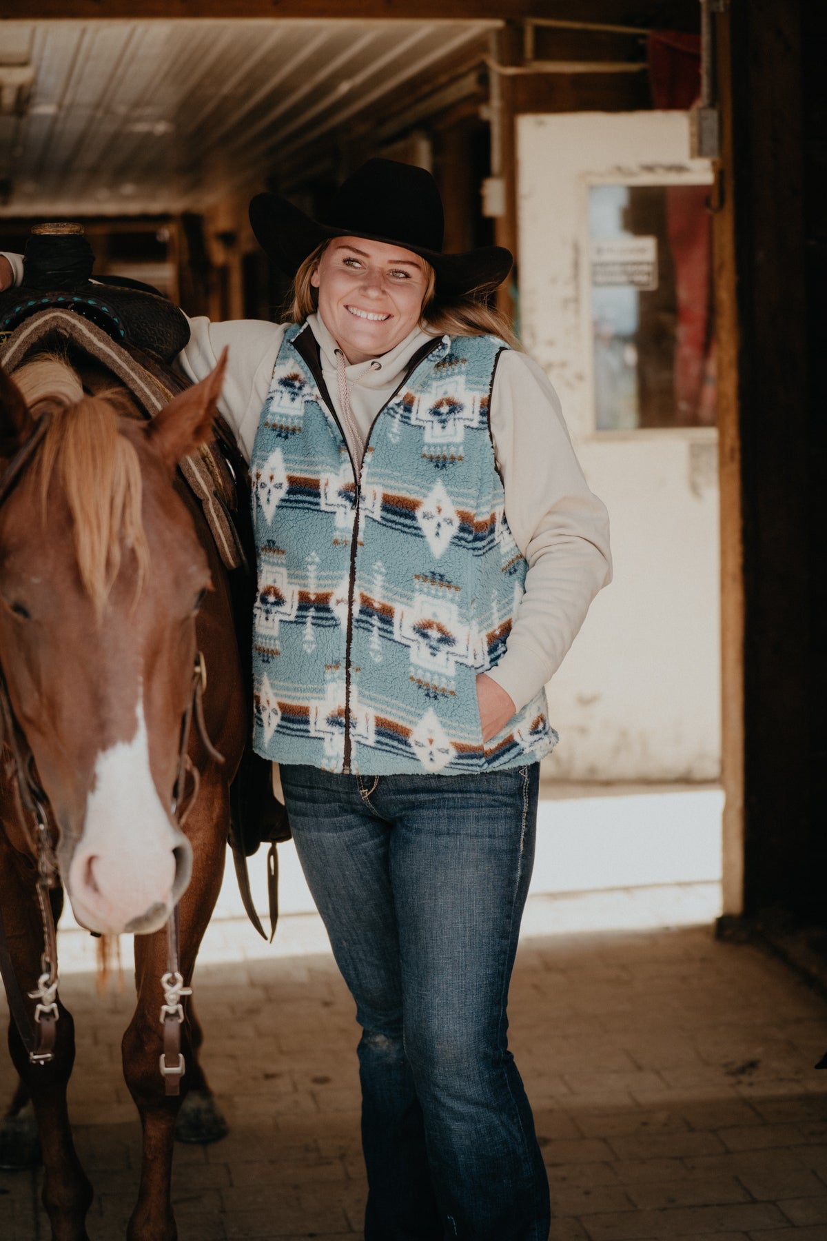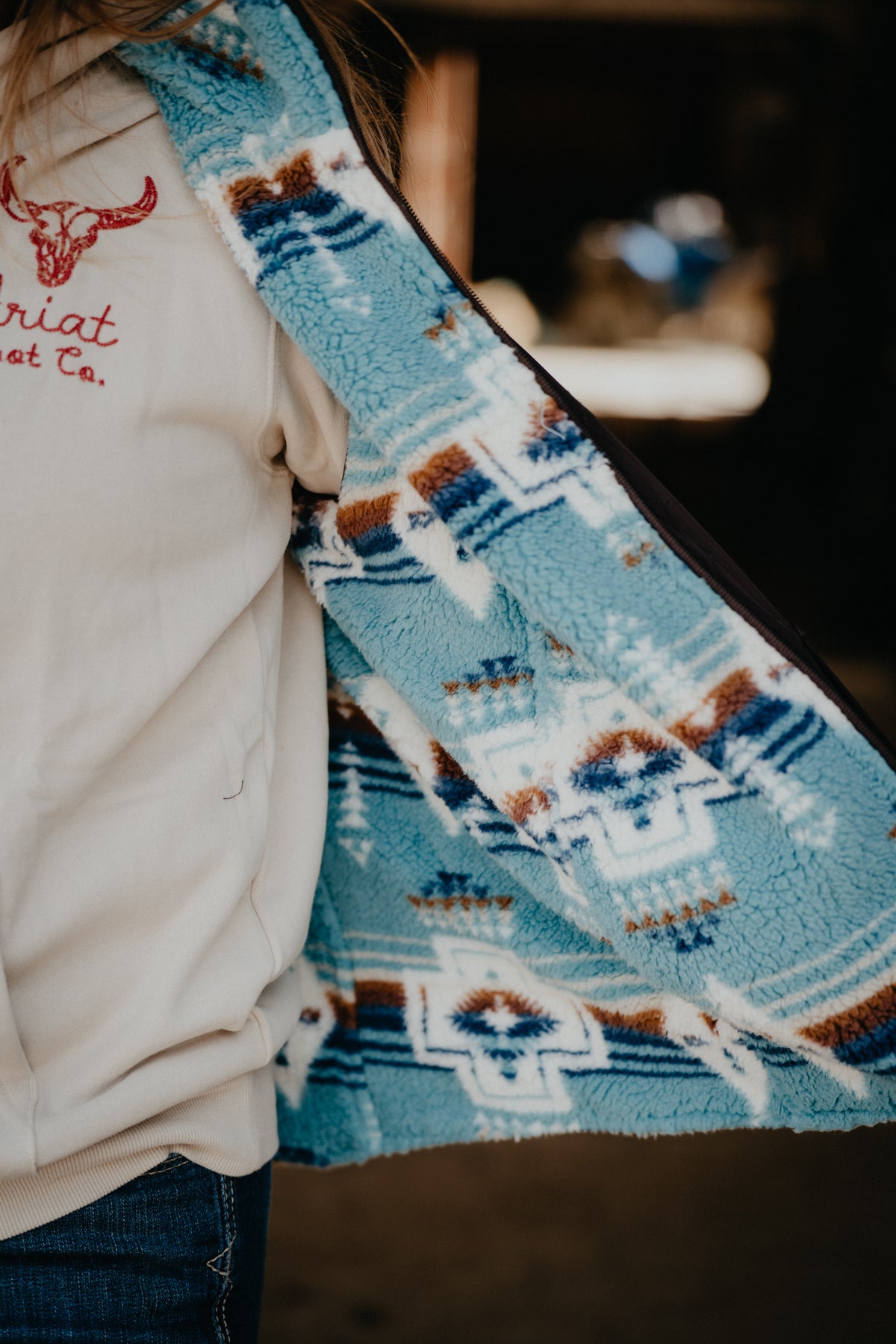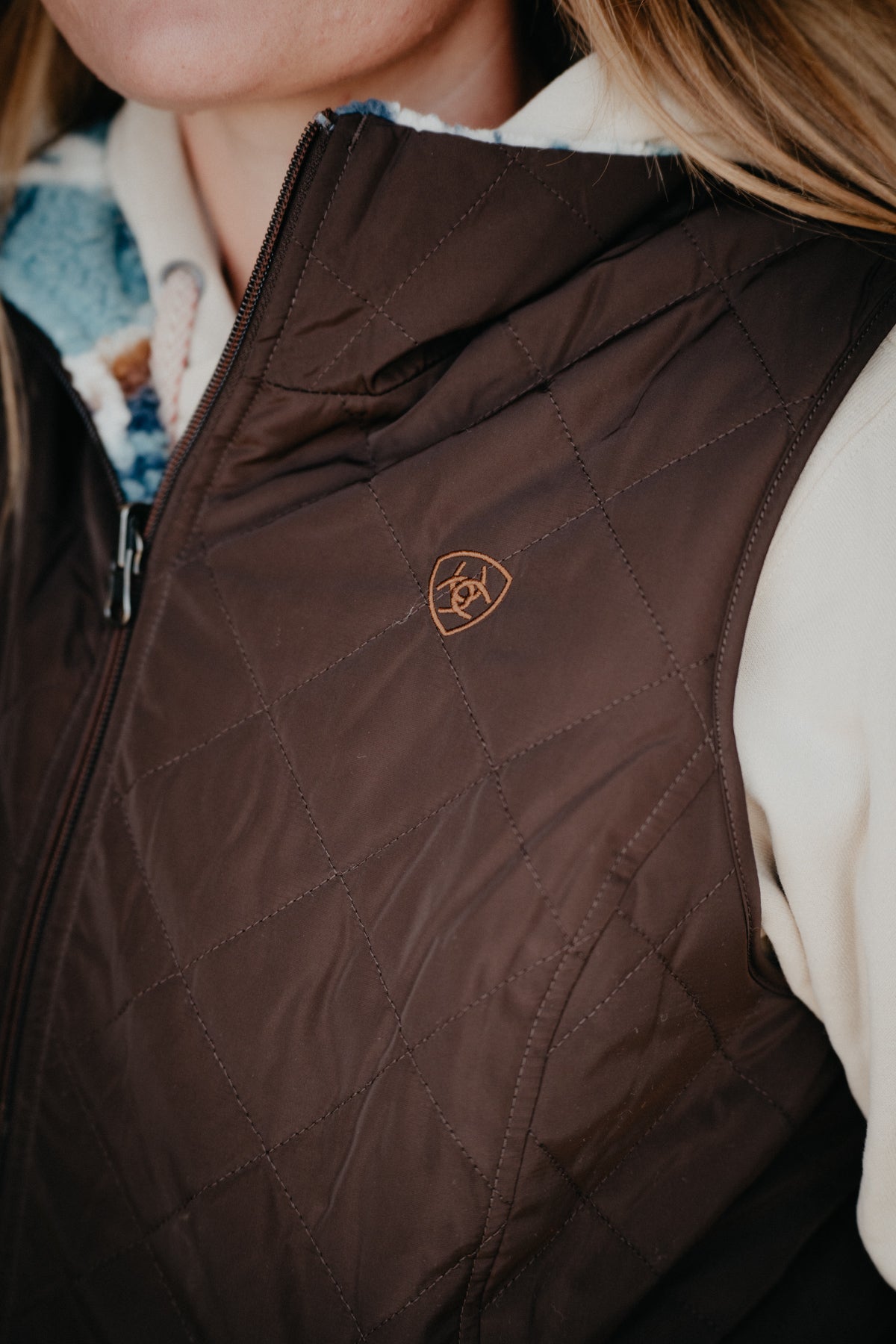 Wowsers!!! This vest is a functional favorite that Ariat offers - but this year with a stunning Quilted rich brown shell. Featuring a super cozy teal and ivory printed aztec lining. We love the fit with open hip pockets, and embroidered Ariat logo located on the front left chest! The perfect weight for warmer winter days and all throughout the spring - and the best part, she's reversible!