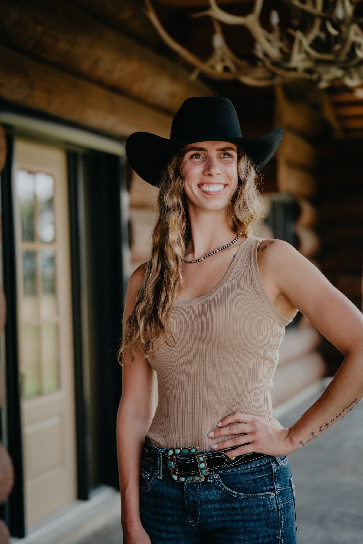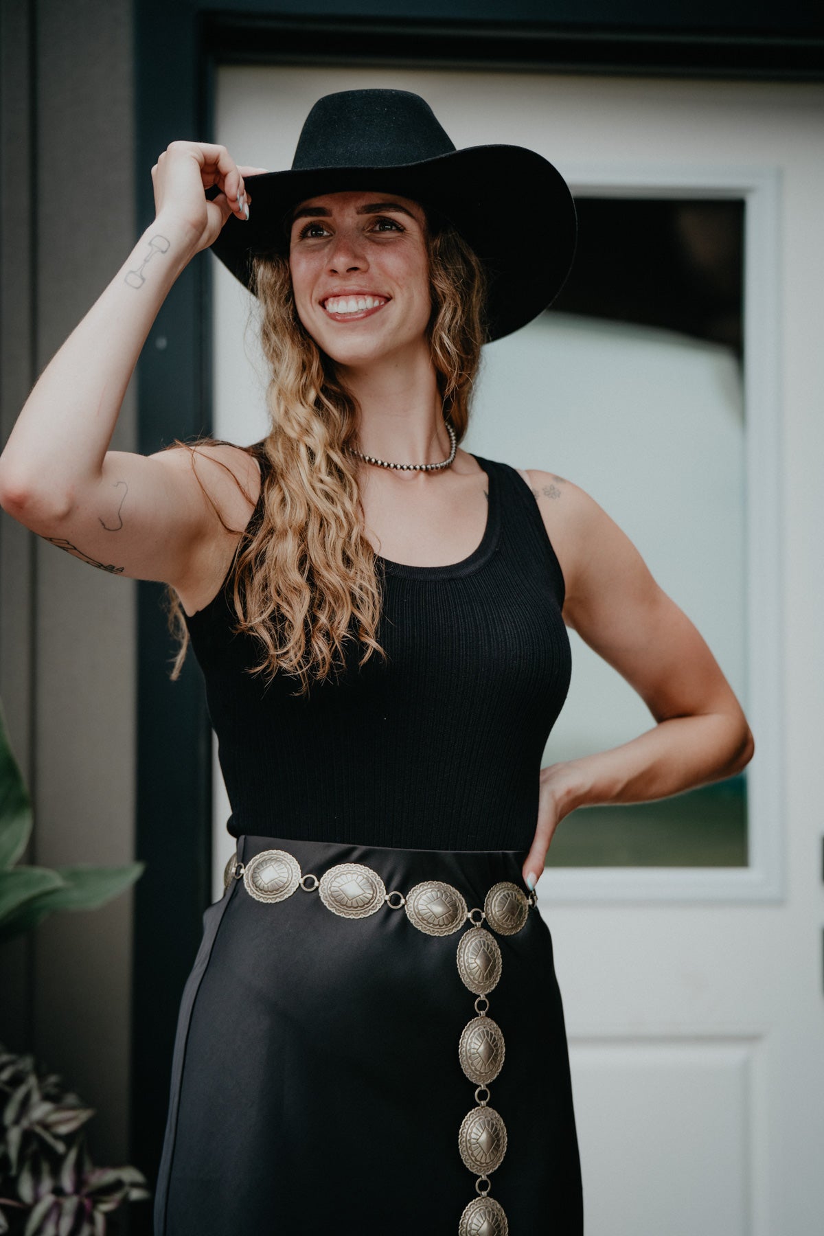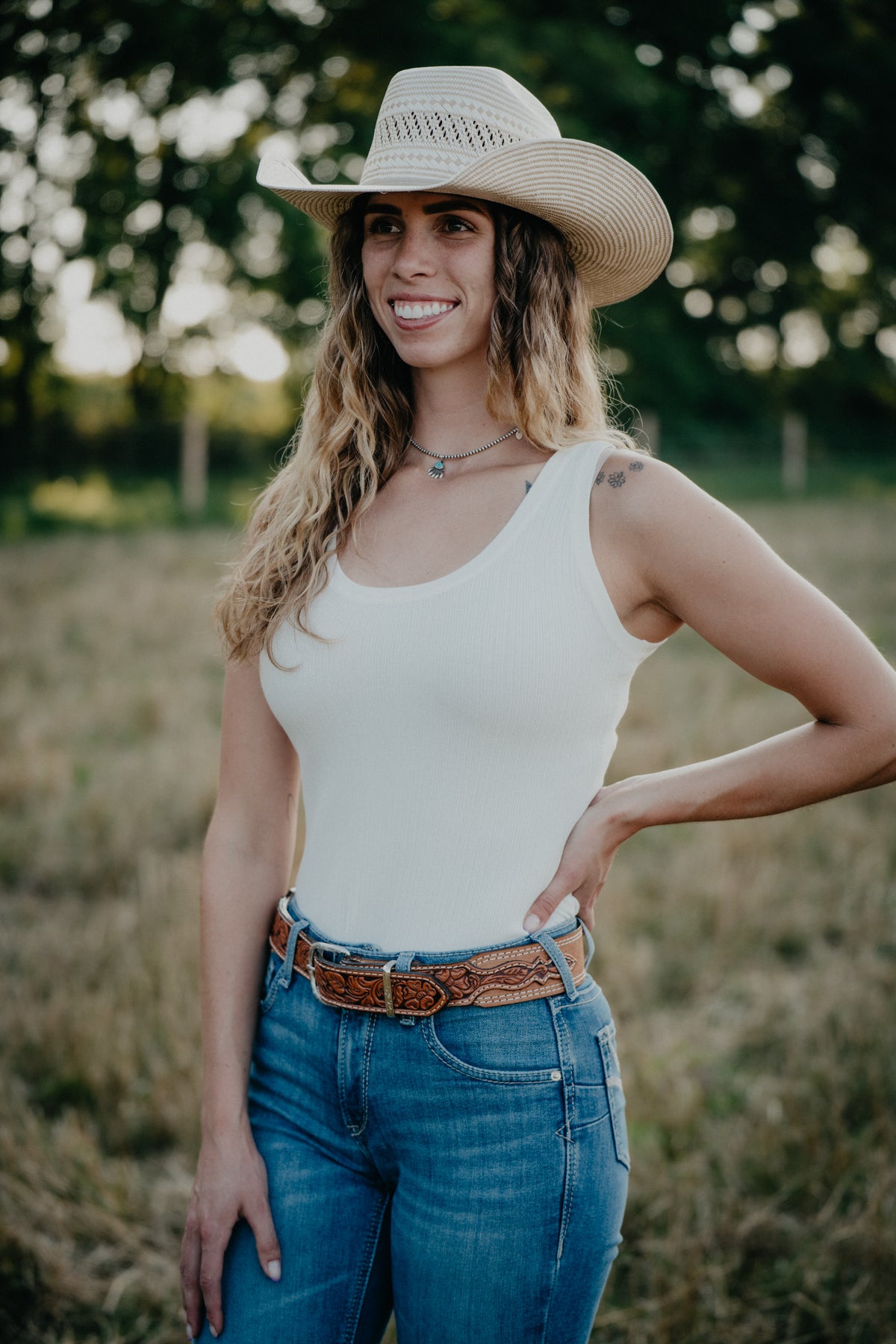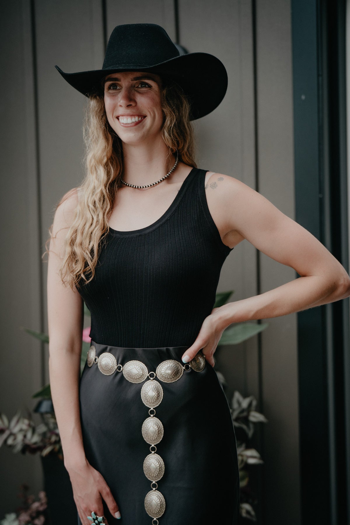 Grace has this styled with 'Izabel' Luxe Satin Skirt and 'Billie' Ultra High Rise Trouser by Ariat. Sarah has this paired with 'Olivia' High Rise Stove Stop Jean by Kimes.