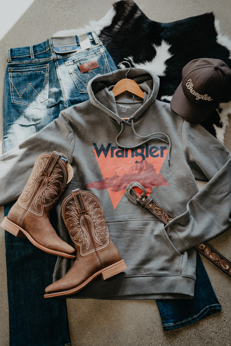 This laid-back layer combines a soft grey foundation with an eye-catching red-toned scenic graphic that captures that authentic Western edge! The adjustable drawstring hood seals in warmth, and the front kangaroo pocket keeps your hands happy on chilly days. Built with Wrangler's signature durability, it's the kind of piece that works just as hard as you do, whether you're heading to the ranch or just kicking back at home.