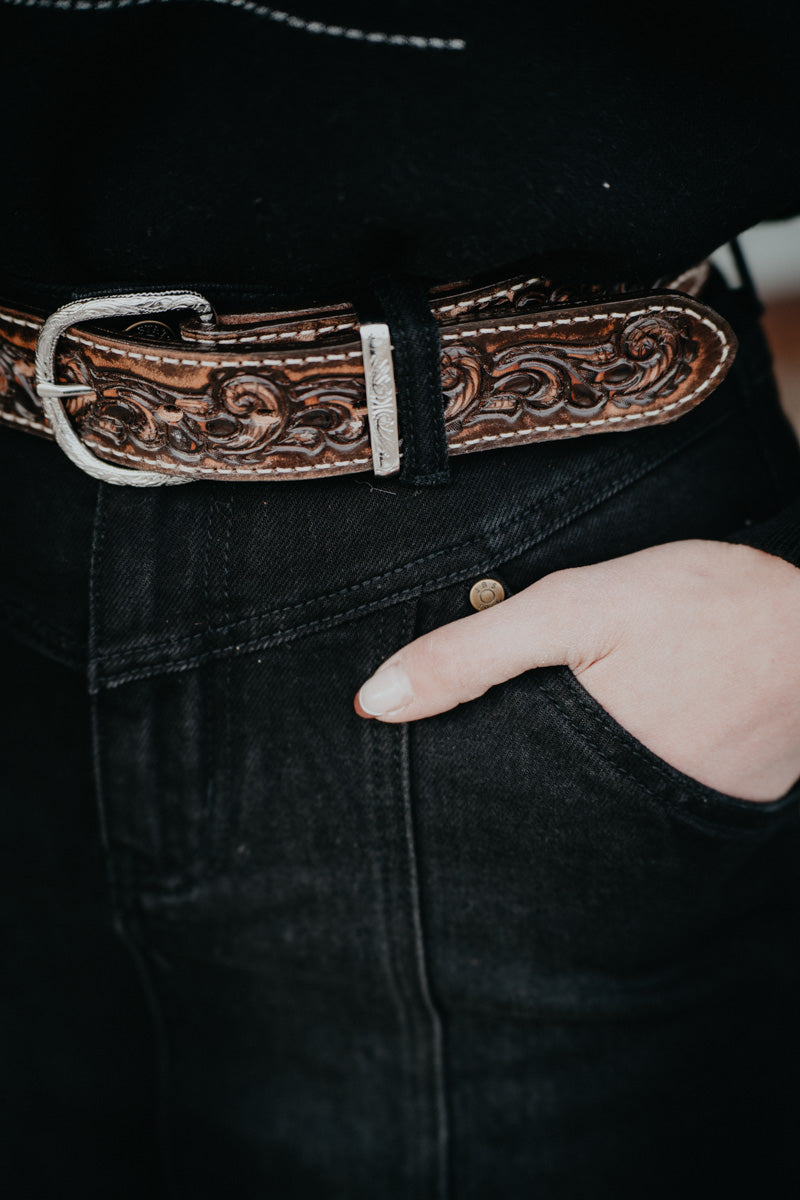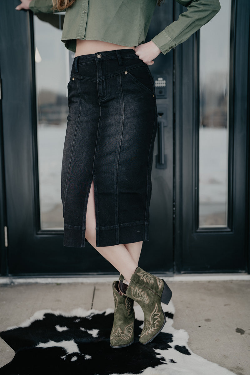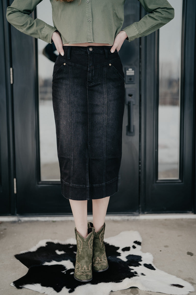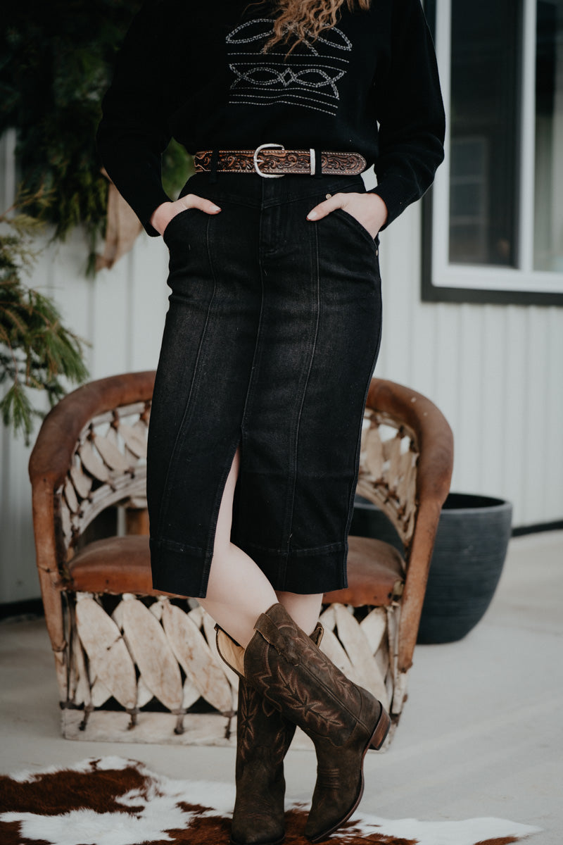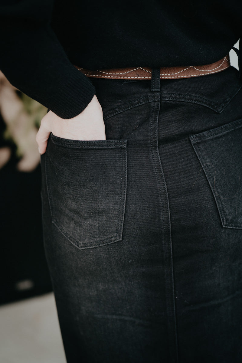 The 'Hailey' Black Stretch Maxi Skirt brings Western-inspired edge to your everyday rotation! Crafted in classic black denim with a flattering stretch fit, this skirt features bold front seams with a cheeky slit at the hem for movement and style. Yoke detailing frames the front and back, while bronze button accents add authentic Stetson flair. Practical hip and back pockets keep your essentials close, and belt loops let you cinch it just right!