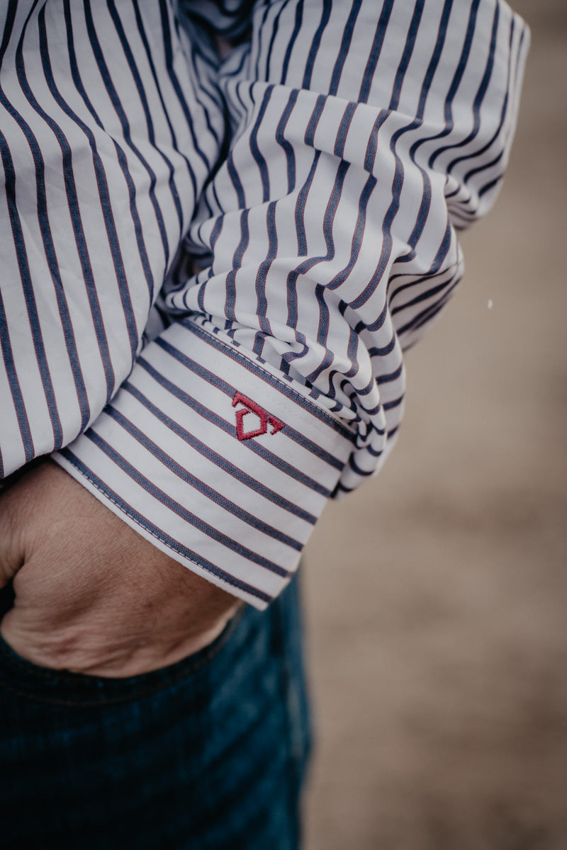 Meet your new go-to shirt: the 'Jax' from Wrangler's Cody Johnson COJO collection! This long-sleeve stunner pairs a crisp white foundation with eye-catching black and red vertical pinstripes that'll have you turning heads. Button up the white front, adjust the single-button cuff, and stash your essentials in the chest pocket—everything you need for a polished, country look. Whether you're hitting a honky-tonk or just want to add some personality to your wardrobe, this shirt's got the goods!