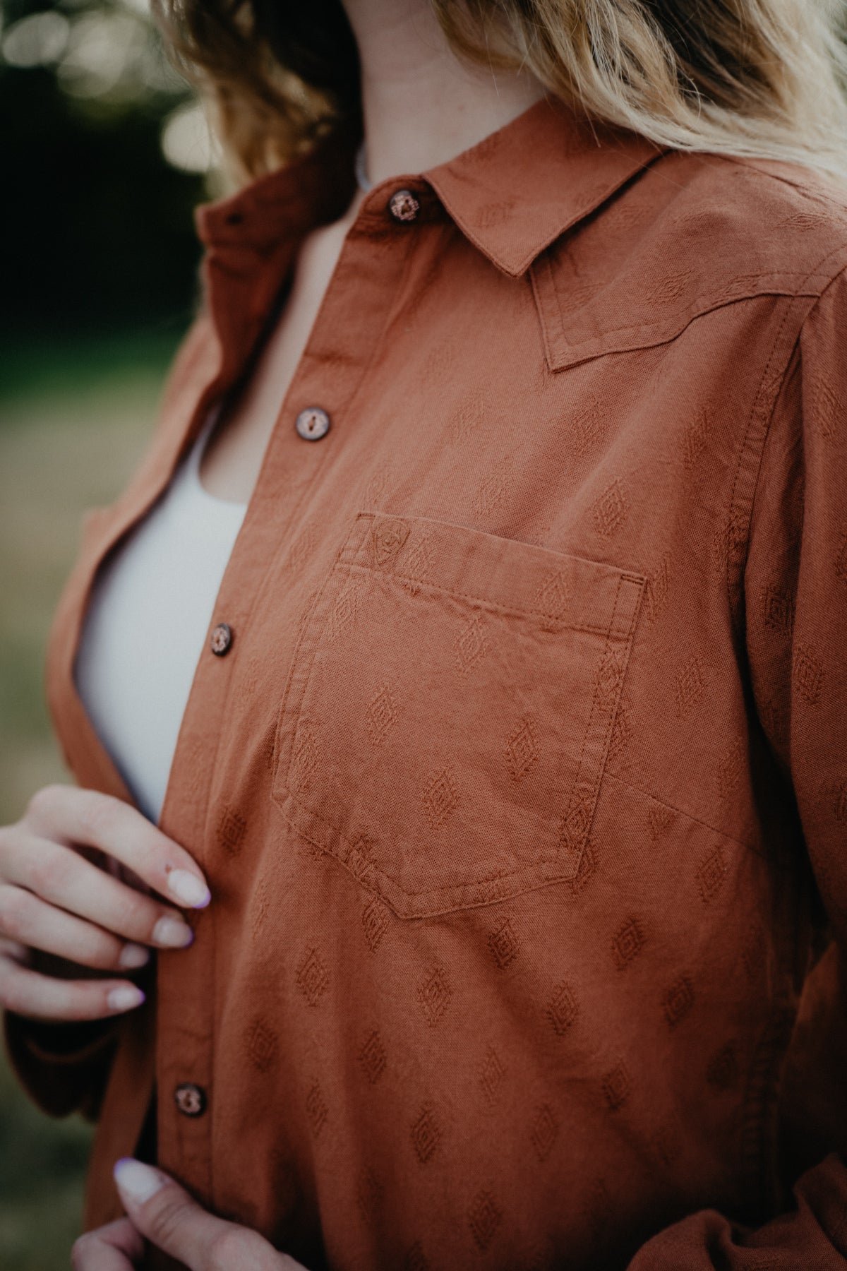 A true western staple for the season ahead! The 'Jean' shirt comes in a rich ginger orange that feels right at home in the fall lineup. Finished with copper Aztec-style buttons, subtle embroidery, and a classic yoke, it’s ready for days in the saddle, trips to town, or cool evenings on the ranch. Wear it buttoned up with your favourite denim or open as a laid-back layer.