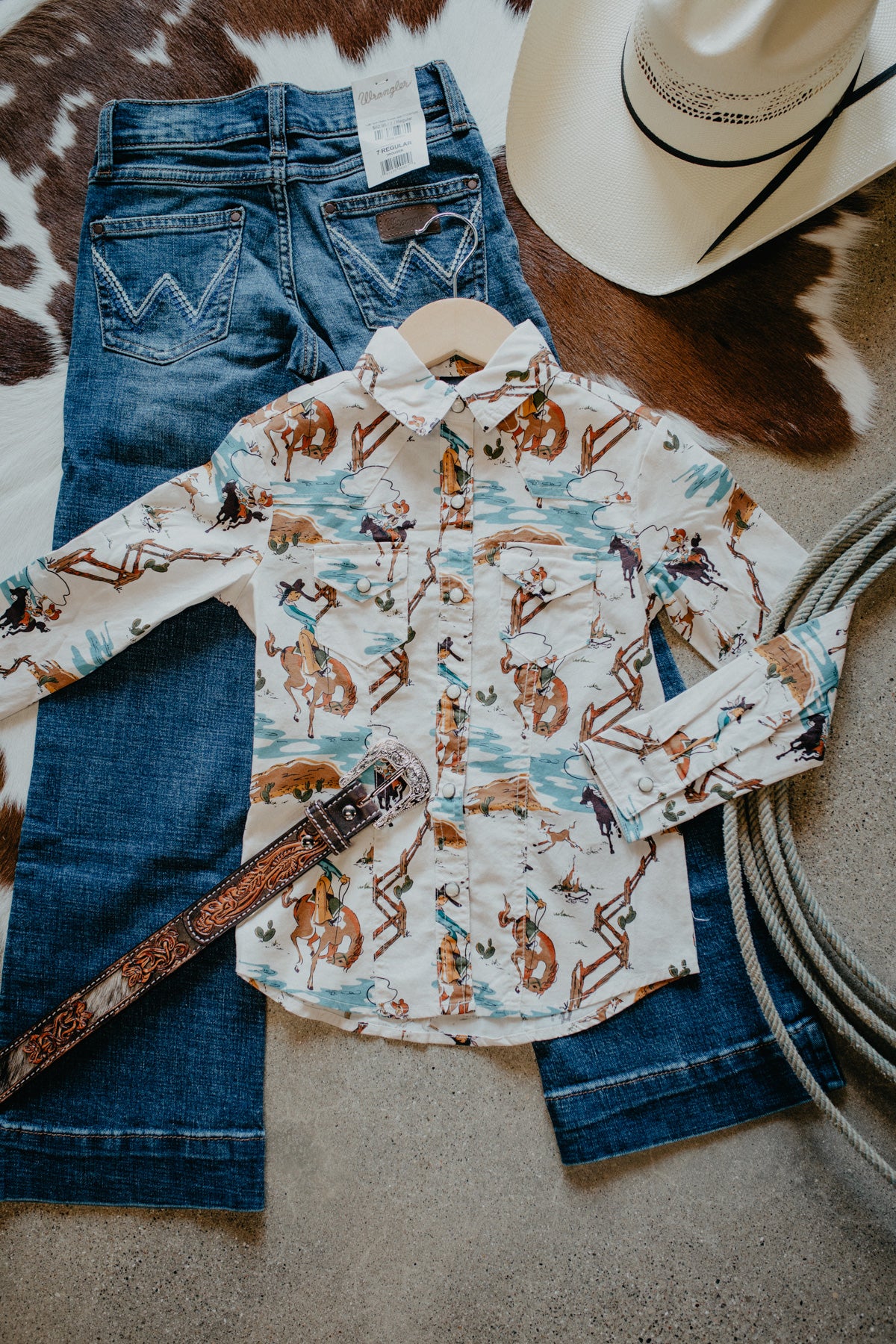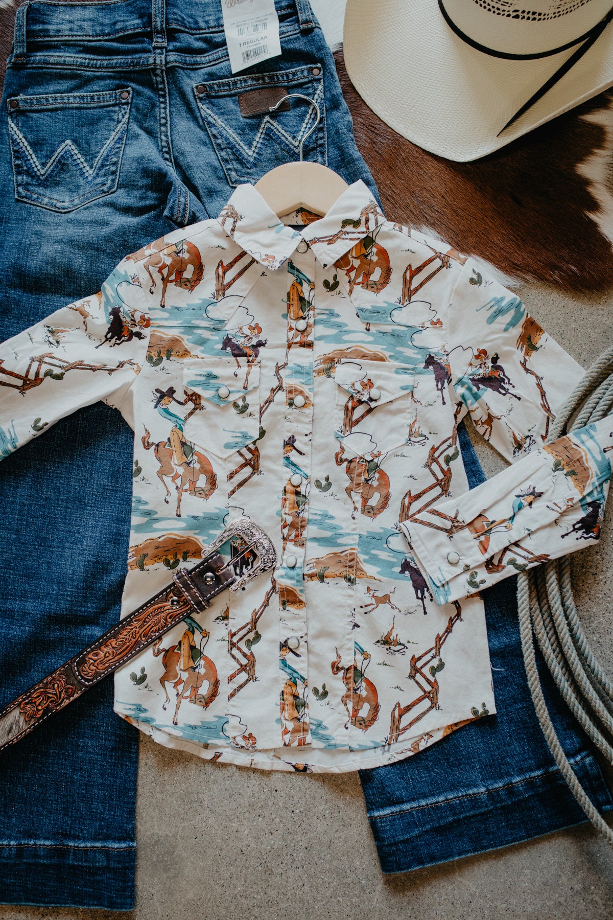 Straight out of a storybook and into the wild west—this pearl snap shirt brings playful charm to classic cowboy/cowgirl style! With a white base and a retro-inspired print featuring cowboys/cowgirls roping cattle, desert cacti, and old wooden fencing, it captures the magic of ranch life through a child’s eyes.