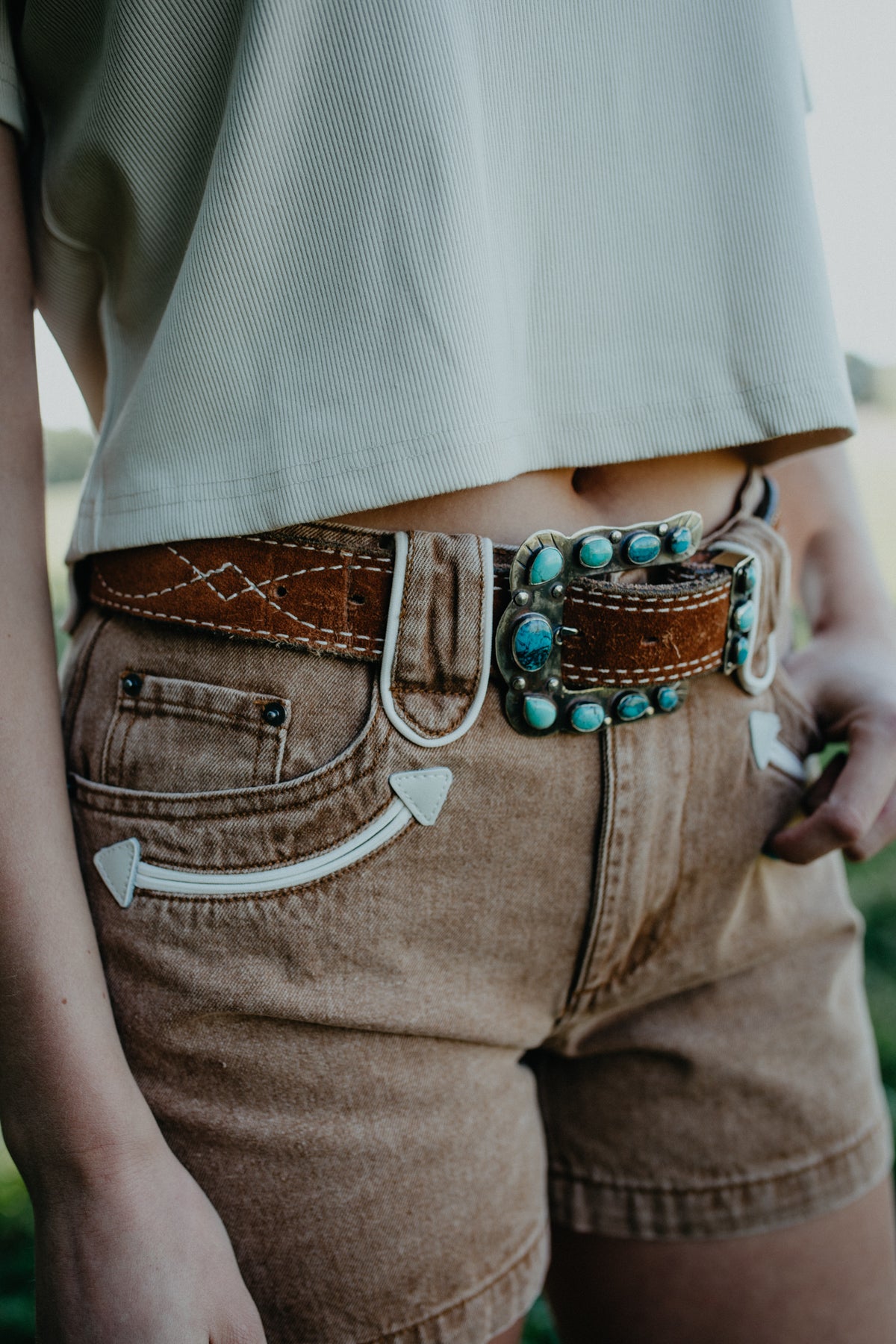 Paired with our 'Stella' cropped tee by Ariat and Camel Suede Figure 8 Belt by Double J Saddlery.