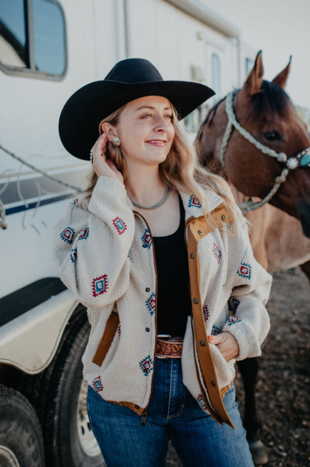 You can't go wrong with a sherpa jacket, especially this 'Kinslei' Ariat Cream Sherpa Jacket! The burgundy and turquoise Aztec print add the right amount of western flare! This sherpa has caramel canvas accents a front zipper and button closure. The texture on this beautiful jacket is phenomenal and super warm perfect for fall weather!