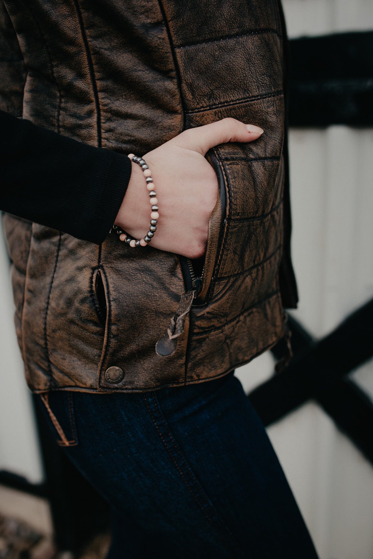 STS is our top choice for authentic, high-quality leather and cowhide items and this vest does not disappoint! The body boasts an incredibly luxurious feel, with its soft and silky texture. You'll stay cozy and secure thanks to the sturdy metal zipper and handy hip pockets. This vest truly stands out, featuring a stunning cowhide that drapes beautifully over your shoulders. It's tough enough for riding but stylish enough to turn heads.