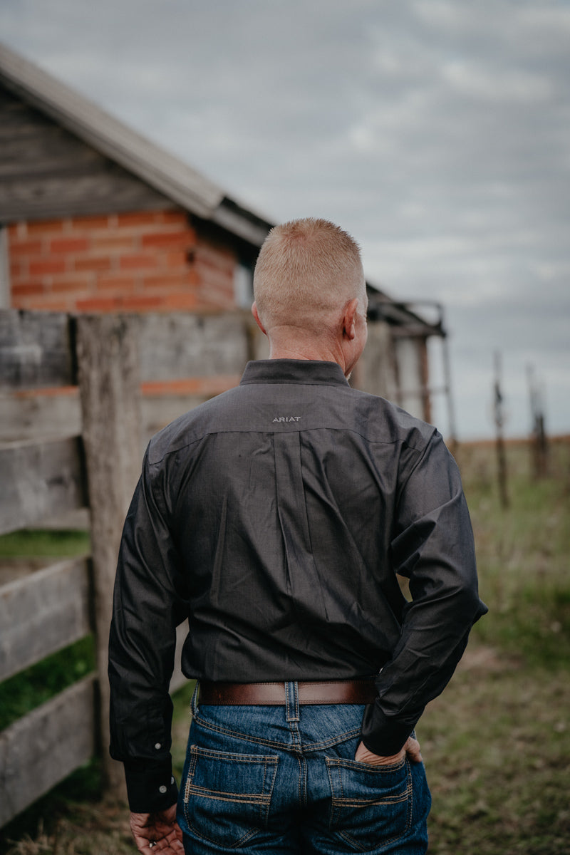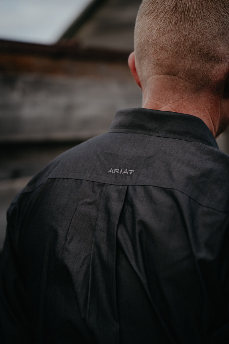 This classic, timeless solid dark dark charcoal button up from Ariat is perfect for everything from the board room to the arena! The Wrinkle free , cotton fabric fabric keeps you feeling comfortable and looking your best without the need to iron!