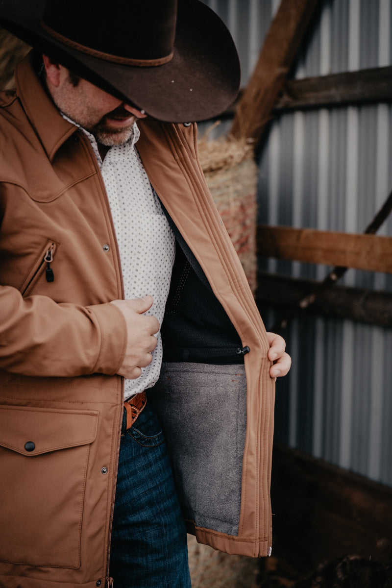 Meet your new grab and go barn coat— 'Luca' is built for style and function! Crafted from soft shell material with a cozy fleece lining, this extended-length coat keeps you comfortable whether you're mucking stalls or hitting the trails. Dual front zippers and snap closures give you easy layering options, while strategically placed chest hand-warming pockets and two-way hip pockets keep your essentials close. Hip snaps add extra mobility for mounted adventures, and the sharp yoke detail adds a touch of Western flair!