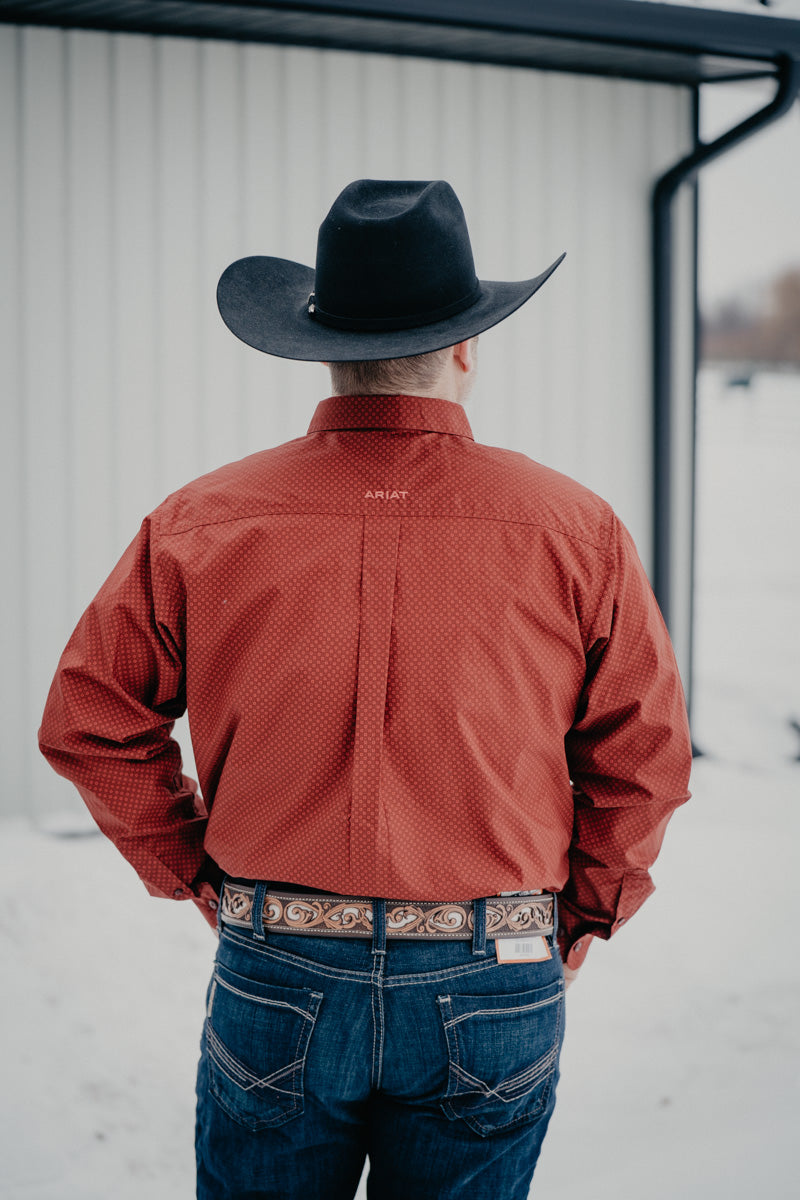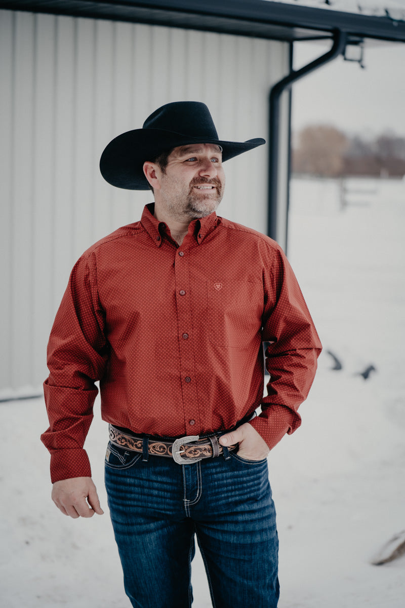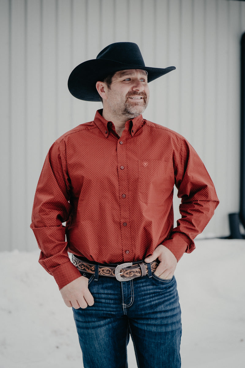 Meet the Lucas—your new go-to button up in a striking rust-red with eye-catching geometric patterns! This Ariat piece brings personality to your wardrobe with the extended cut that gives you room to move, while that embroidered logo on the left chest pocket proves you've got taste. Whether you're heading to the ranch or just want to look effortlessly put together, this one's got you covered!