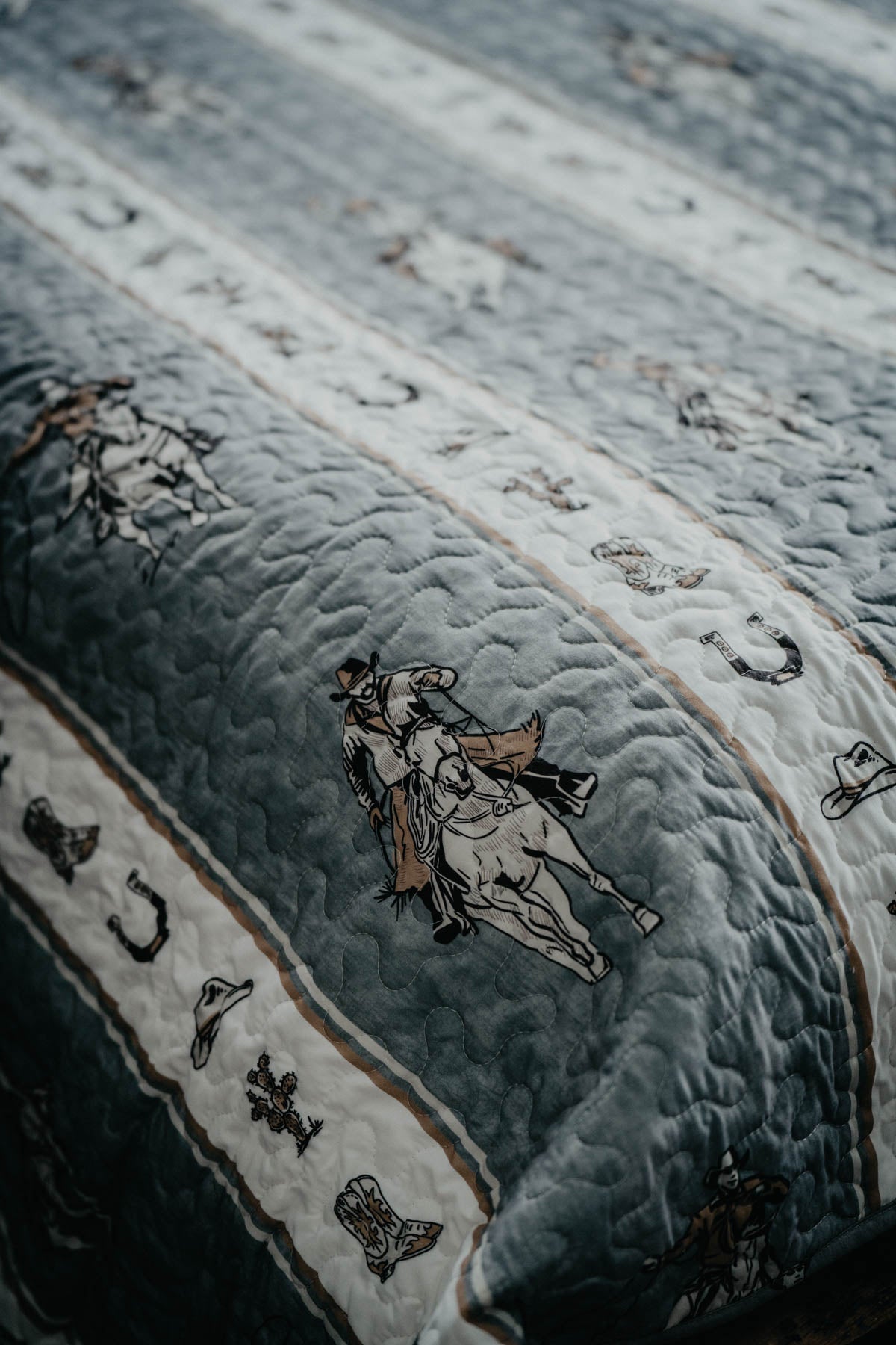 We are excited to introduce a new line of stunning western & farming themed quilt sets, made from start to finish right in Texas, USA! Made from a luxuriously soft feeling, durable 100% microfibre that you will look forward to snuggling in! The patterns are stunning - the 'Marshall' Cowboy Striped print features a roping cowboy repeating pattern on a blue/grey striped block, along with western motifts in the alternativing white striped block. Earthy accents of camel colours throughout. Fully reversible with a striped camel coloured print on the back for an alternative look, or added texture when you style it folded back. Oversized size to suit even the deepest of mattresses. Comes with matching shams.