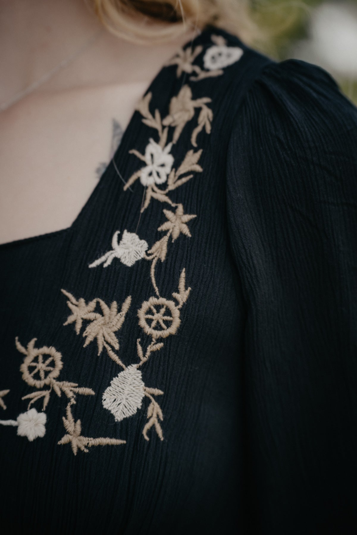 - Embroidery across neckline, front waist & front lower hemline