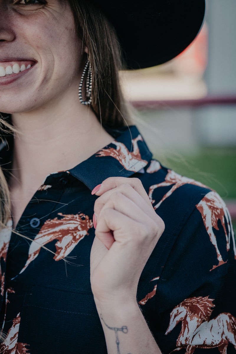 Meet 'Malory' your new go-to dress for effortless style! This maxi stunner features a chic collared neckline and full button front, all set against a sleek black base adorned with a stunning white and rust horse print. The adjustable tie waist lets you cinch it just right for a flattering fit that works for any occasion!