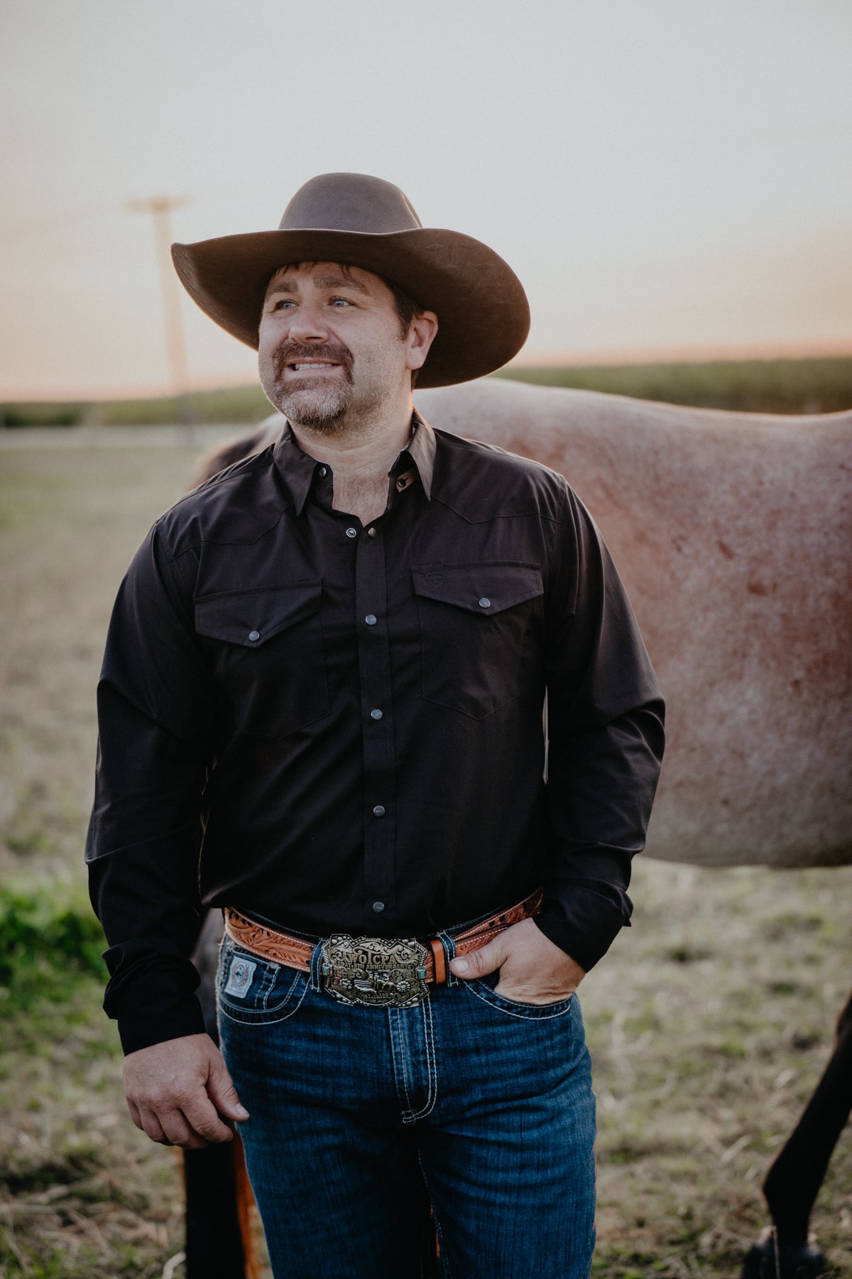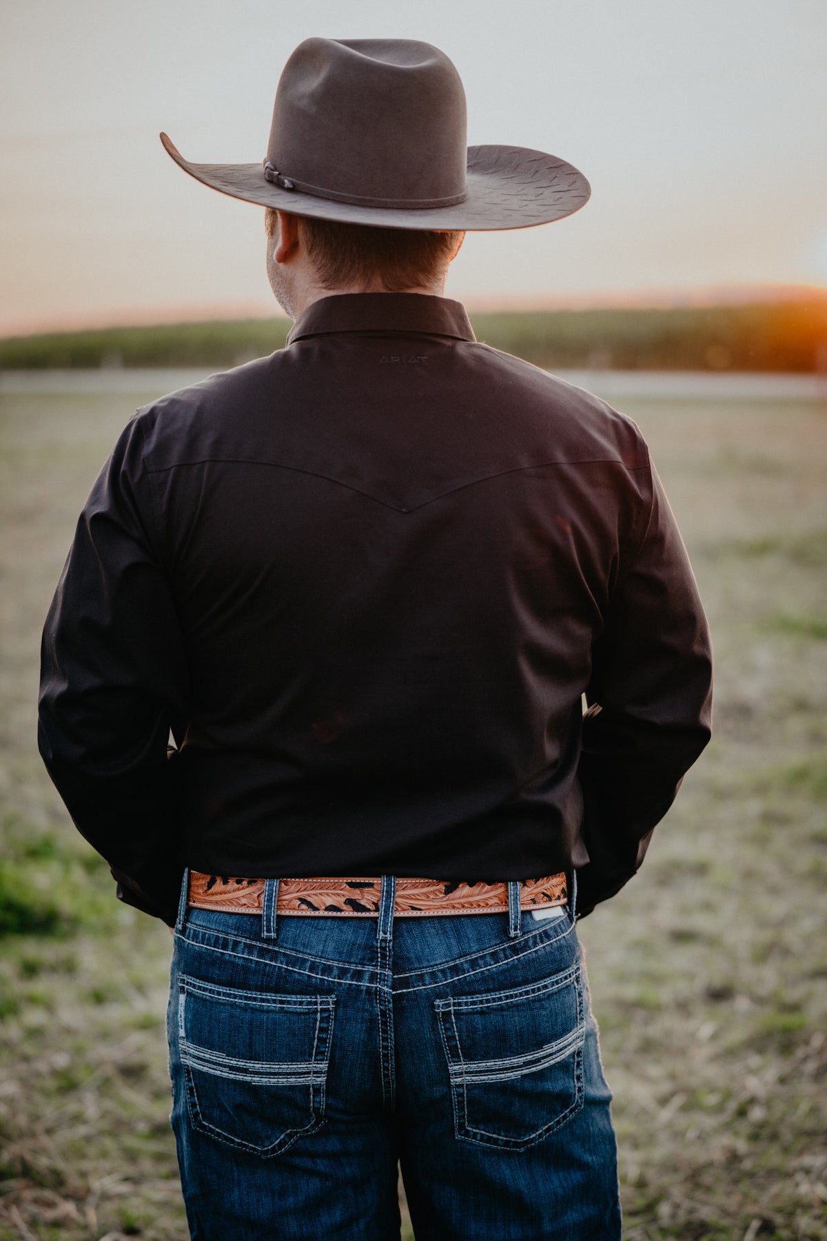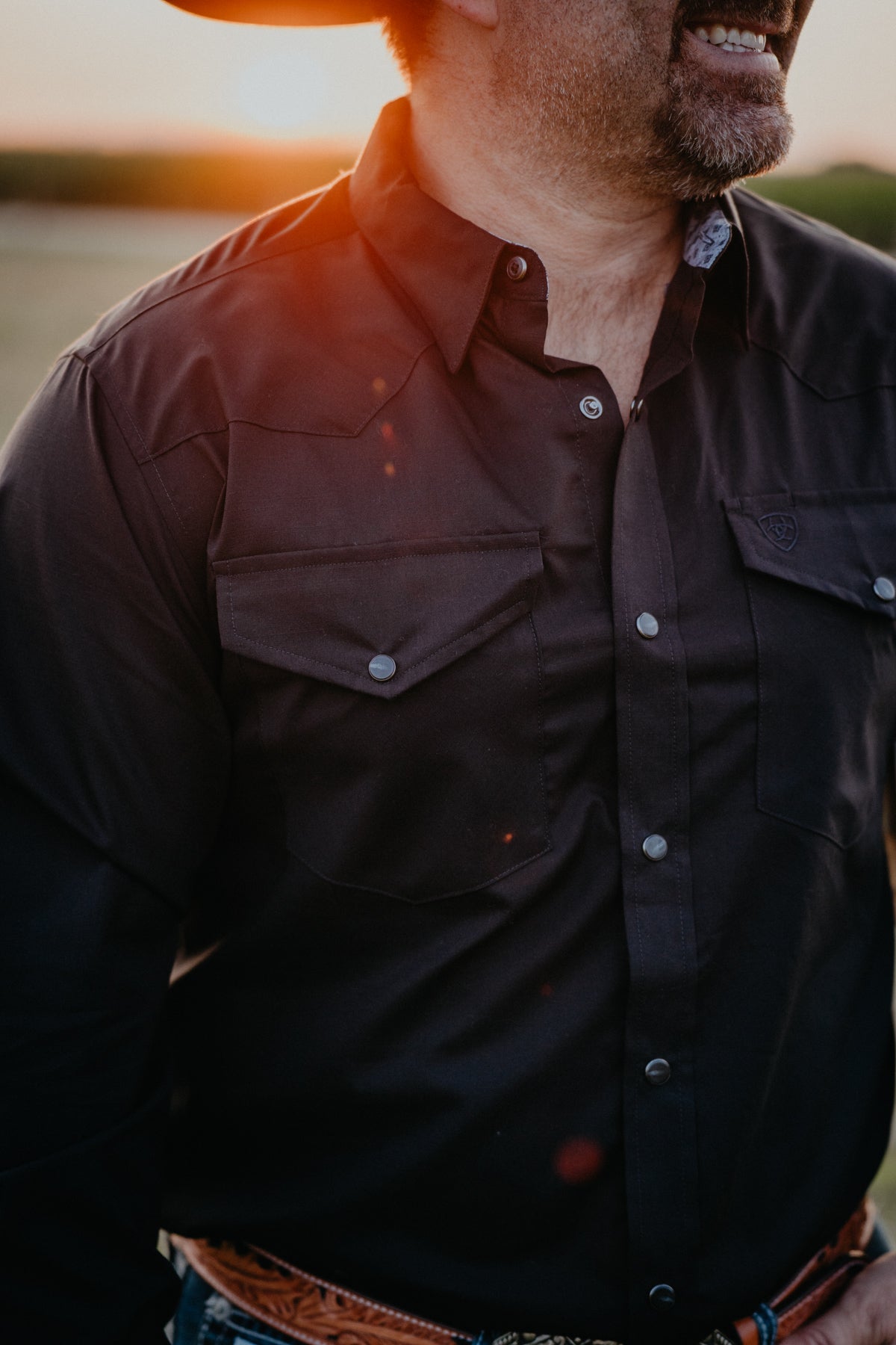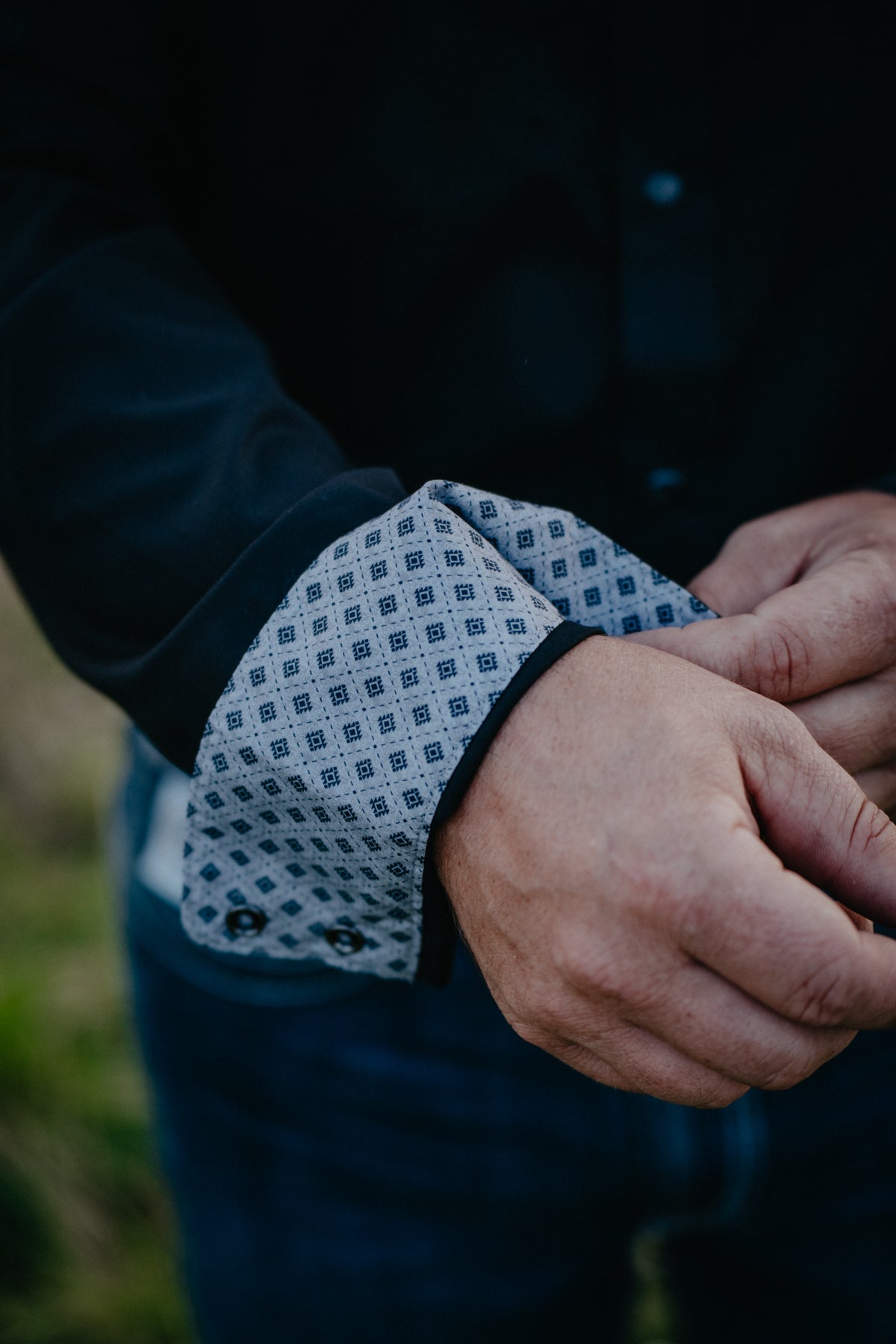 Introducing another great Wrinkle-free shirt option from Ariat's Classic Fit Men's line. This is the 'Tate', super simple, long lasting, dressy and that great performance quality look and feel. This one features a black solid with small blue geometric prints contrasting wrist and collar cuffs. Such an excellent shirt for any event, you just cant go wrong with a solid classic button up by Ariat!